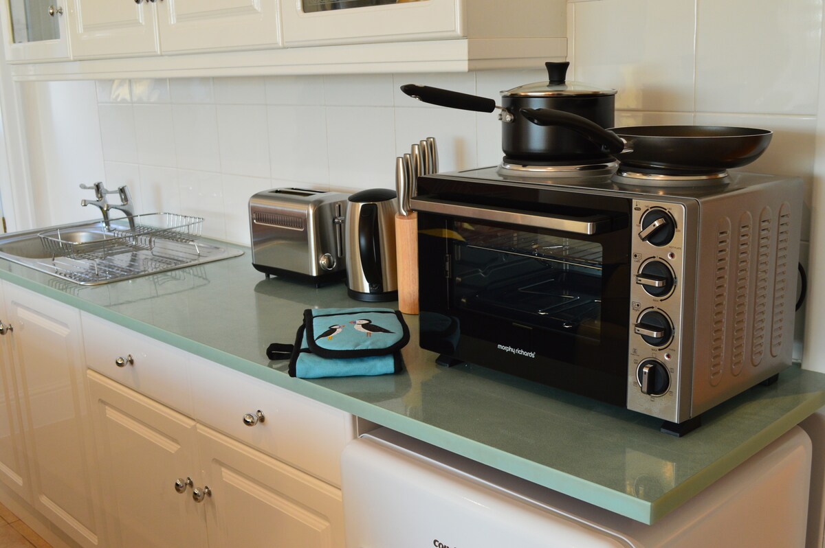 Düzü spiralvari pilləkənlə qonaqpərvər, isti və rahat bir məkana daxil edin. Düz yerdə retrodan ilhamlanmış mebel və mebellər var. Qonaq otağı/yemək otağı kiçik rəng parçaları olan mavi rəngdədir və dincəlmək və səhər yeməyi yemək üçün bağa baxan möhtəşəm mənzərəsi var. Mətbəx və hamamın maraqlı dizaynı var, təmiz və təravətlidir, ehtiyacınız olan bütün imkanlara malikdir. Yataq otağında rahat standart ikinəfərlik çarpayı, qaranlıq pərdələr və çoxlu asma yeri var.