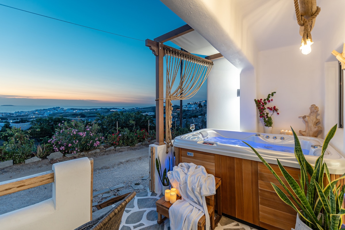 Gözəl mənzərəli və baxımlı bağları olan, səmimi, kənd kompleksində qurulmuş sonsuzluq hovuzundan istifadə ilə tam təchiz olunmuş 40 kvm-lik fərdi iaşə süitaları. Lüks italyan mebelləri, Netflixli düz ekranlı televizor, çox sürətli Wi-Fi. Egey dənizi, ətrafdakı adalar və gün batımı boyunca 270 dərəcə valehedici mənzərəsi olan öz terras və göyərtə. Əsas Çora şəhərinə çox yaxın, keyfiyyətli, təhlükəsiz və rahat mühit axtaran cütlüklər və ailələr üçün uyğundur. Şənlik insanları üçün uyğun deyil!!