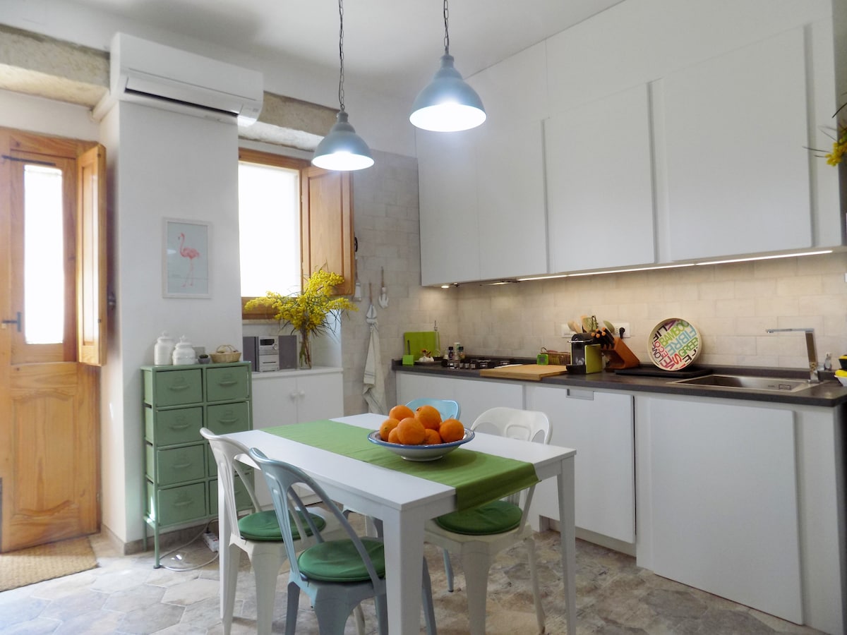 Ecazkar Sardiniya kəndi olan Karlofortun mərkəzində yerləşən bu birinci mərtəbədəki mənzil sakit bir məkanın rahatlığı ilə mərkəzi həyatın rahatlığını birləşdirir. Daxil olduqdan sonra sizi qabyuyan maşın da daxil olmaqla hər bir müasir rahatlıqla təchiz edilmiş geniş qonaq mətbəxi gözləyir. Geniş masa 6 nəfərə qədər insanı rahat yerləşdirə bilər. Bu məkan inandırıcı şam yeməyi və ya ailə yığıncaqları üçün idealdır.