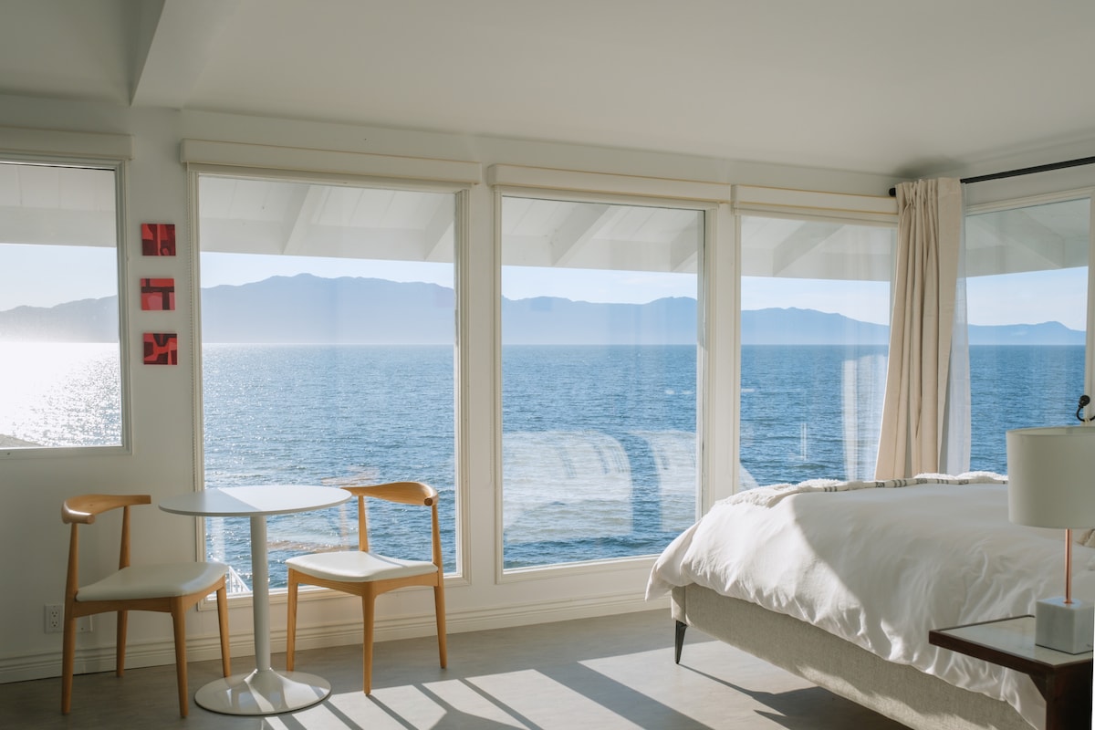 Seaview Suite — Oceanfront Stay Closest to the Water A bright 600 sq ft retreat with a king bed and full ensuite. Located closest to the shoreline, with easy access to the lower decks where the ocean feels just steps away. Guests enjoy access to 6.3 acres, ocean views, hot tub, sauna, outdoor shower, and expansive decks.