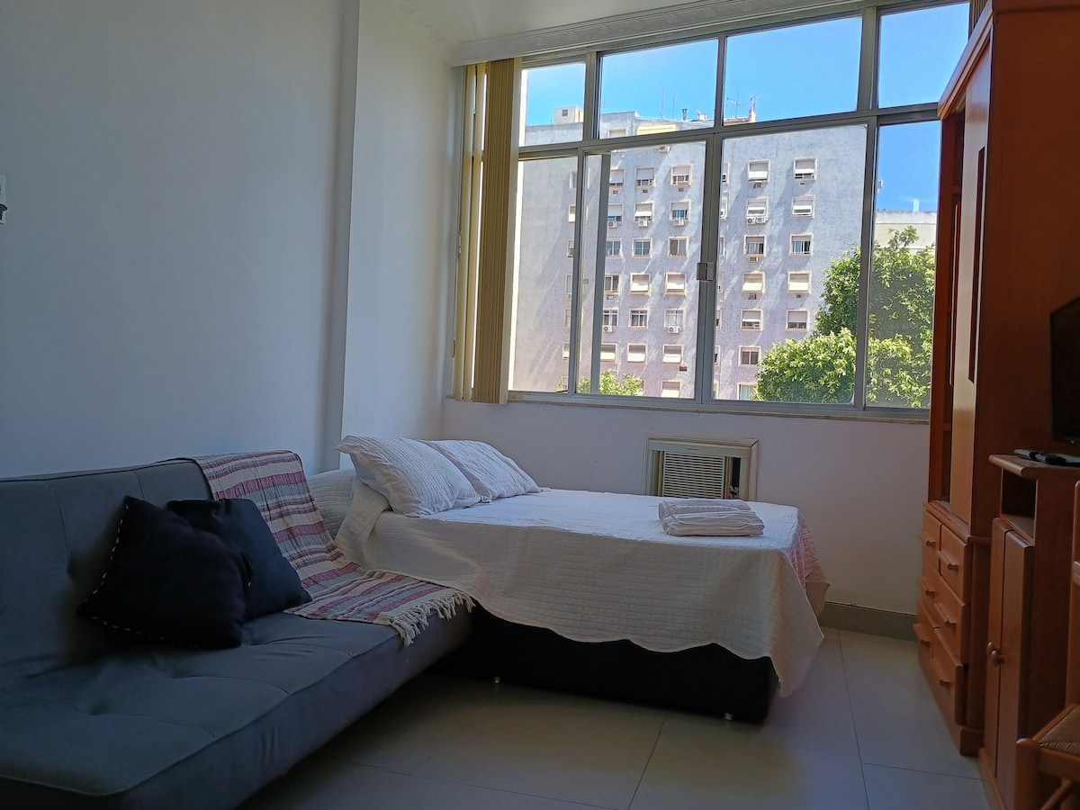 FLAT RIO - Kit net aconchegante, com cama de casal e sofá cama de solteiro. Ar condicionado, Internet com Wi-Fi, Smart TV 32" com Netflix e Globoplay. Cozinha equipada com fogão, geladeira, micro ondas, air fryier, sanduicheira, liquidificador, cafeteira expresso. Prédio familiar em rua silenciosa na quadra da Praia do Flamengo com portaria 24 h e câmeras de monitoramento. Metrô Largo do Machado na porta. Perto de bares, restaurantes, supermercados. Fácil acesso as praias e centro pelo metrô.