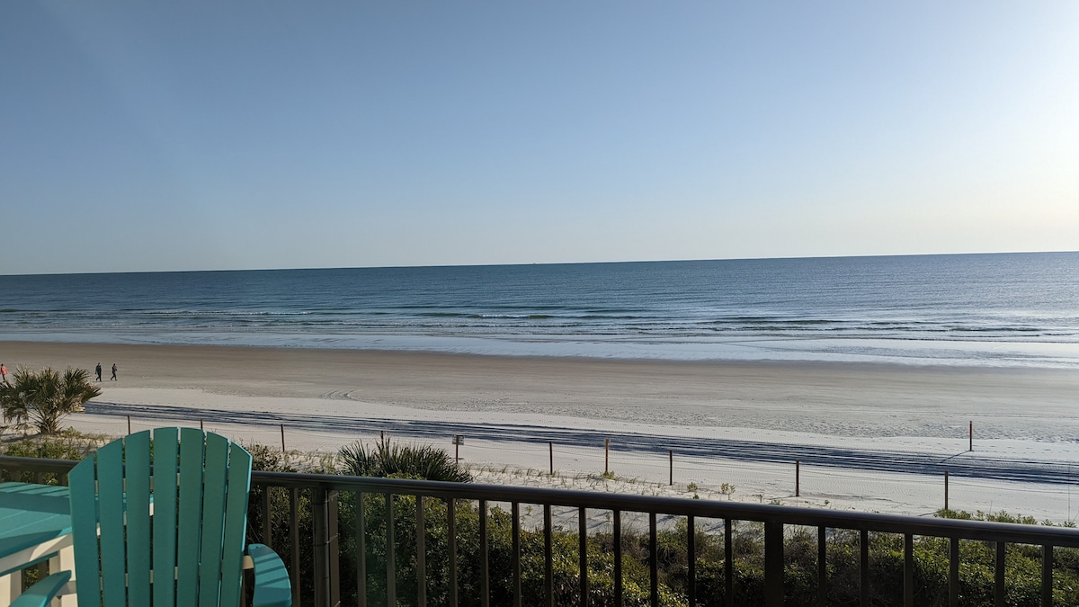 BEST spot to watch the sunrise, (and moonrise) on St Augustine Beach from every room in the condo and from the two direct beach front balconies! CORNER UNIT! TOP FLOOR! One balcony off the upstairs corner primary bedroom suite, walk in closet and ocean view King size beds in each bedroom. Anytime is a good time to be on the beach in St. Augustine! Winter Spring, Summer, or Fall! Besides being steps from the beach there are plenty of local eateries,great food, live music within walking distance.