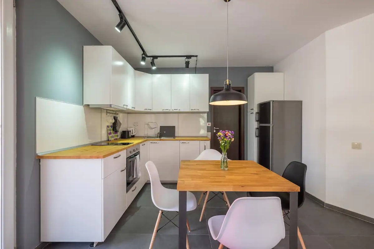 Müasir dizaynı funksionallıq və müstəsna rahatlıq ilə birləşdirən bu rahat studiyaya xoş gəlmisiniz. Yeni təmirdən çıxmış və təzə, yüksək səviyyəli səyahətçi üçün gözəl təchiz edilmiş - yeni hamam otağı, tam imkanlara malik kiçik mətbəx, qəhvə maşını, camaşırxana və quruducu maşın, mikrodalğalı soba, sobalar, qabyuyan maşın, xarici kanalları olan düz ekran televizor (musiqi, film və idman), optik super sürətli internet bağlantısı. Tək macəraçılar, cütlüklər və işgüzar səyahətçilər üçün uyğundur.