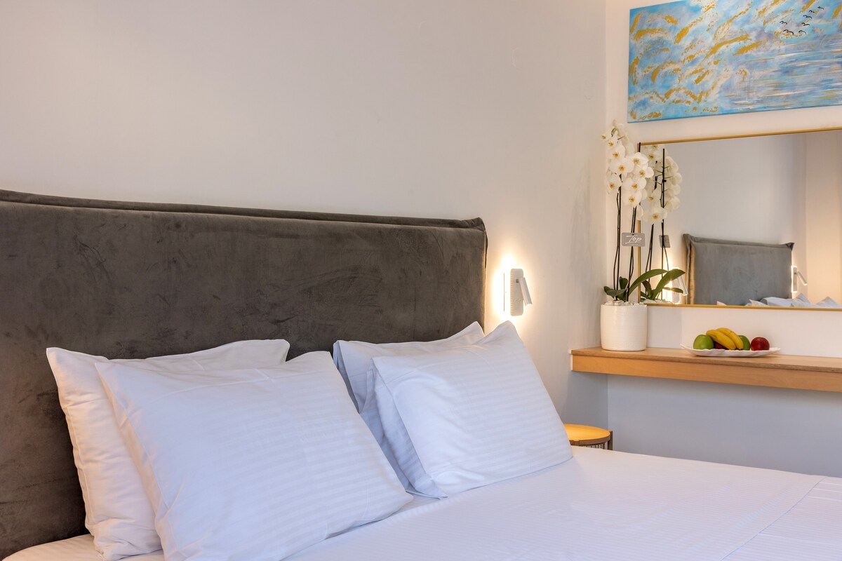 Escape to Seafront Suites, a private hideaway beside a celestial blue sea on Hersonissos stunning Beach Rivera. Nestled on a tranquil and secluded bay with panoramic views and sunsets that dazzle, the rest of the world does not exist, giving you freedom to release your inhibitions and live for the moment. More information Our luxury Suite with garden view is modern and minimalist with extremely comfortable guest rooms, earth tones and modern touches to soothe the mind and warm the soul.