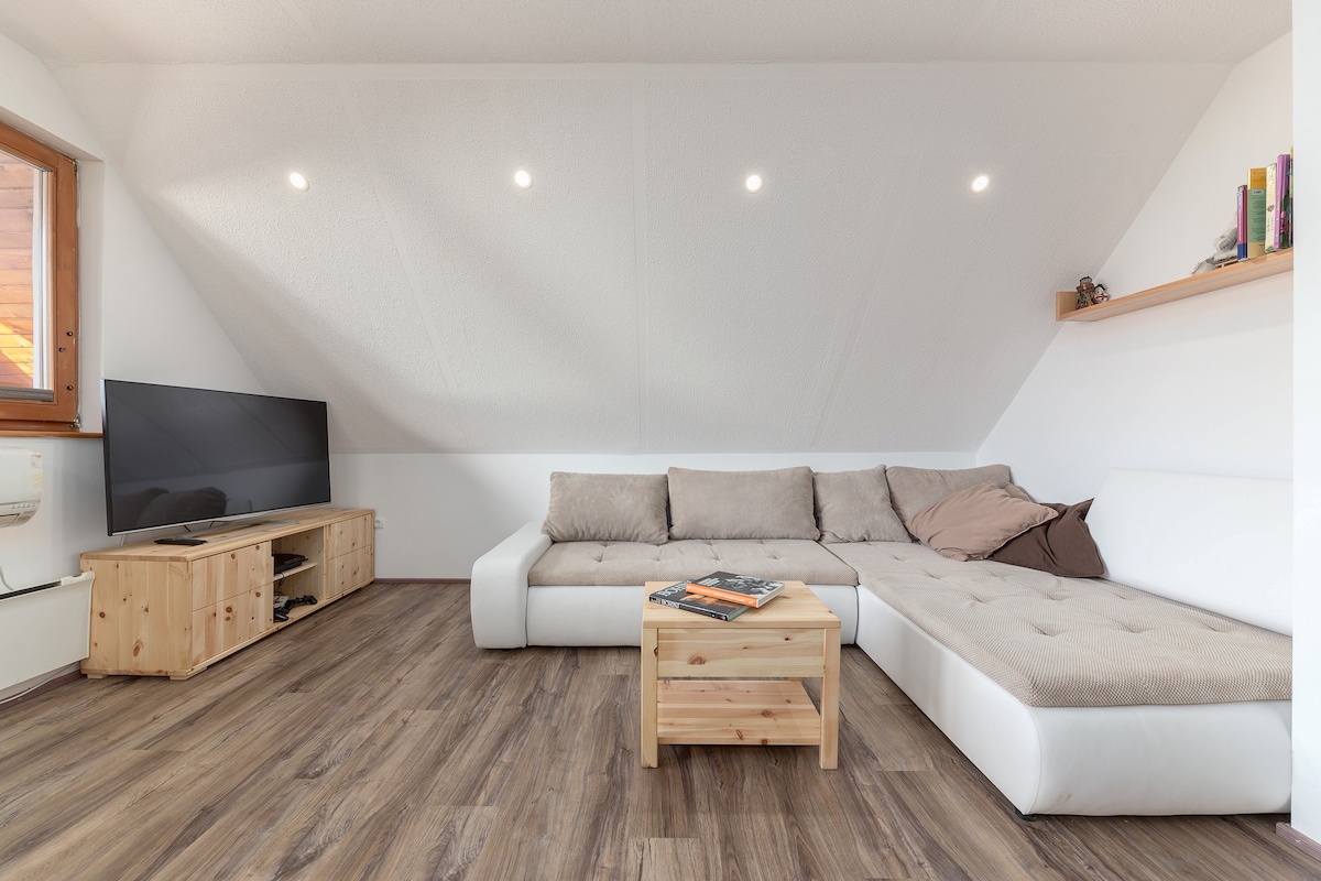 Bright apartment- loft with a great view of the mountains, just a few minutes from lake Bohinj. Black and white with something red - like a cake with a cherry on top :) You'll feel at home and at the same time you’ll be on holidays. Location offers many hiking and bicycle paths and it is close to the ski resorts of Vogel and Soriska planina and a Water park with wellness and only a few kilometres from lake Bohinj, where you can swim, surf, kayak, sup,..., and enjoy the nature.