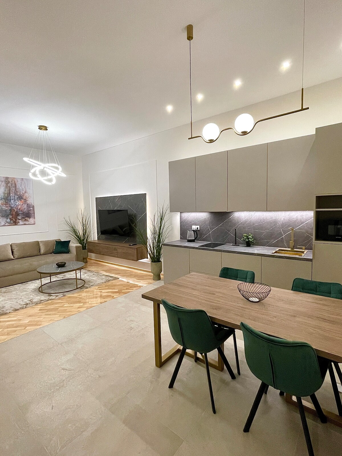 Mənzil bir neçə ay əvvəl tam təmir olunub və hər şey yenidir. Yataq otağında böyük rahat ikinəfərlik çarpayı və qonaq otağında bir böyük divan var. Hamısı təmkinli LED işıqda. Mətbəxdə müasir düz ekranlı ocaq, soba, dondurucu, qabyuyan maşın və paltaryuyan maşın və böyük bar masasından istifadə edə bilərsiniz. Hamam mərmər keramika ilə şüşələnib, çox yığcam və təmizdir. Hamam fen, dəsmallar, gigiyena dəstləri ilə təchiz olunub.