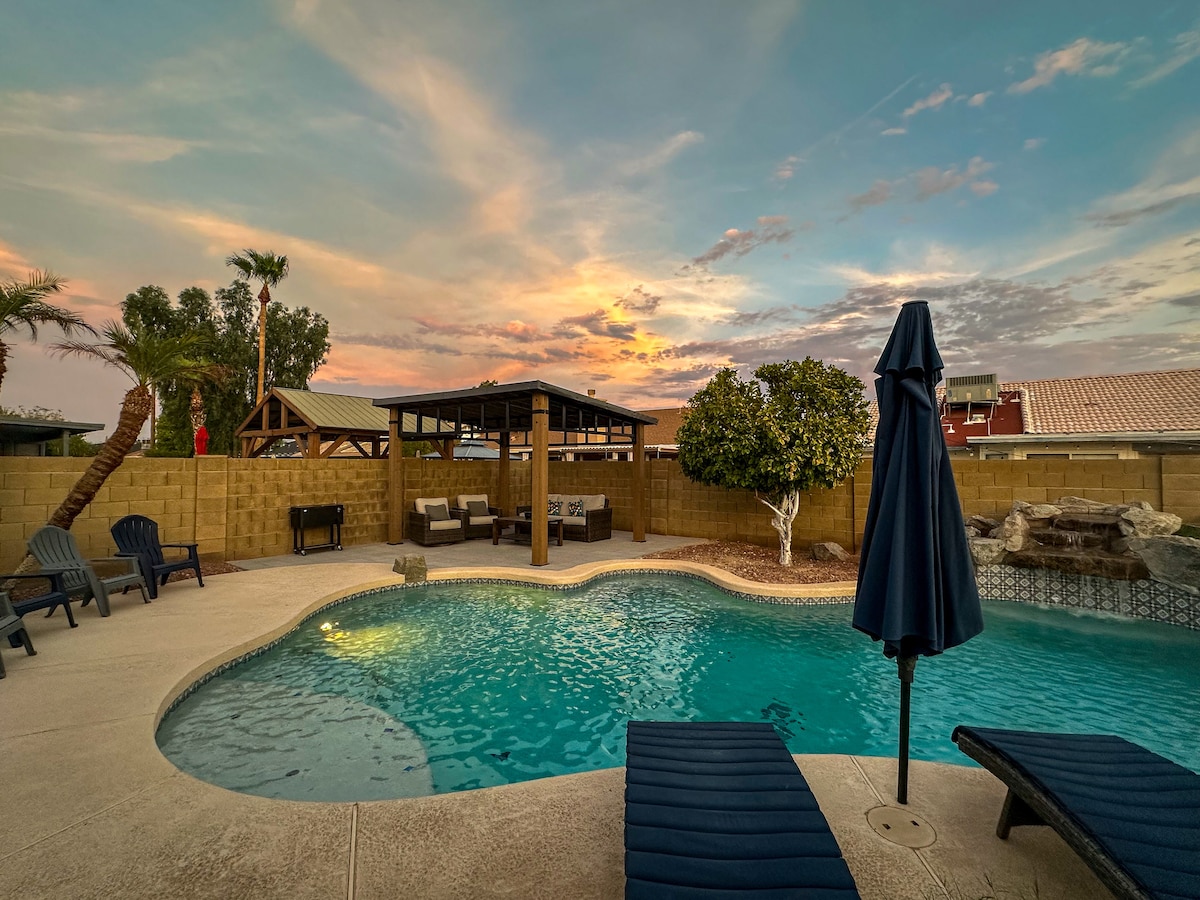 Family friendly Entertaining Home; Large covered patio with plenty of seating, fire table, Treager grill, 10ft private heated pool Oct-May (included). Fully stocked chefs kitchen- double ovens, gas cooktop. Comfy beds, smart TVs in all bdrm’s . Baby/kid items. A perfect location for your Arizona getaway. Only 0.8 miles from the State Farm Stadium, Desert Diamond, Westgate, restaurants and adventures avoid traffic walk to your event! Weekly/Monthly discounts. Essentials for your stay provided.
