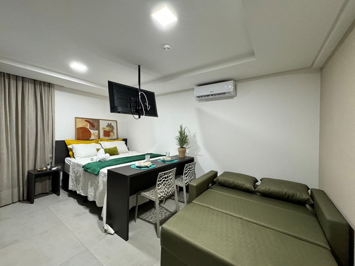 Kondisioner, elektrik duşu, ikinəfərlik çarpayı, minibar, dəstək stulu, kabel televiziyası və paltar asılqanları olan dolab ilə təchiz edilmiş rahat 17m² Süita. Yaxşı yerdə, João Pessoa dəniz kənarında, Mag AVM-in yanında və Manaíra AVM-ə yaxın, həmçinin barlar, restoranlar, dondurma, çörək zavodu, çimərlikdə gəzinti üçün əla yer və ya Manaíra promenadasının yaxınlığında yerləşir.