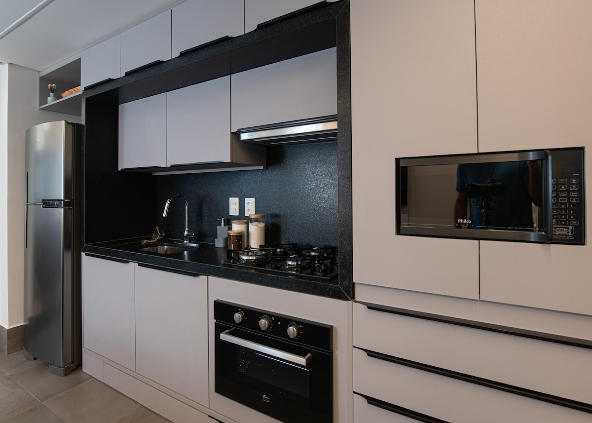 Você vai se sentir em casa, nesse aconchegante flat tipo estúdio, mobiliado com TV Smart, Ar-condicionado Split, geladeira, cooktop, microondas, sanduicheira, cafeteira,liquidificador, secador de cabelos, ferro de passar. Conta com uma cama de casal, mesa, cadeiras e utensílios para cama, mesa e banho. Você fará self check in se identificando na portaria e tendo acesso ao ap através de senha fornecida pela anfitriã. Dispomos de porteiros 24h que facilita o check in e check out.