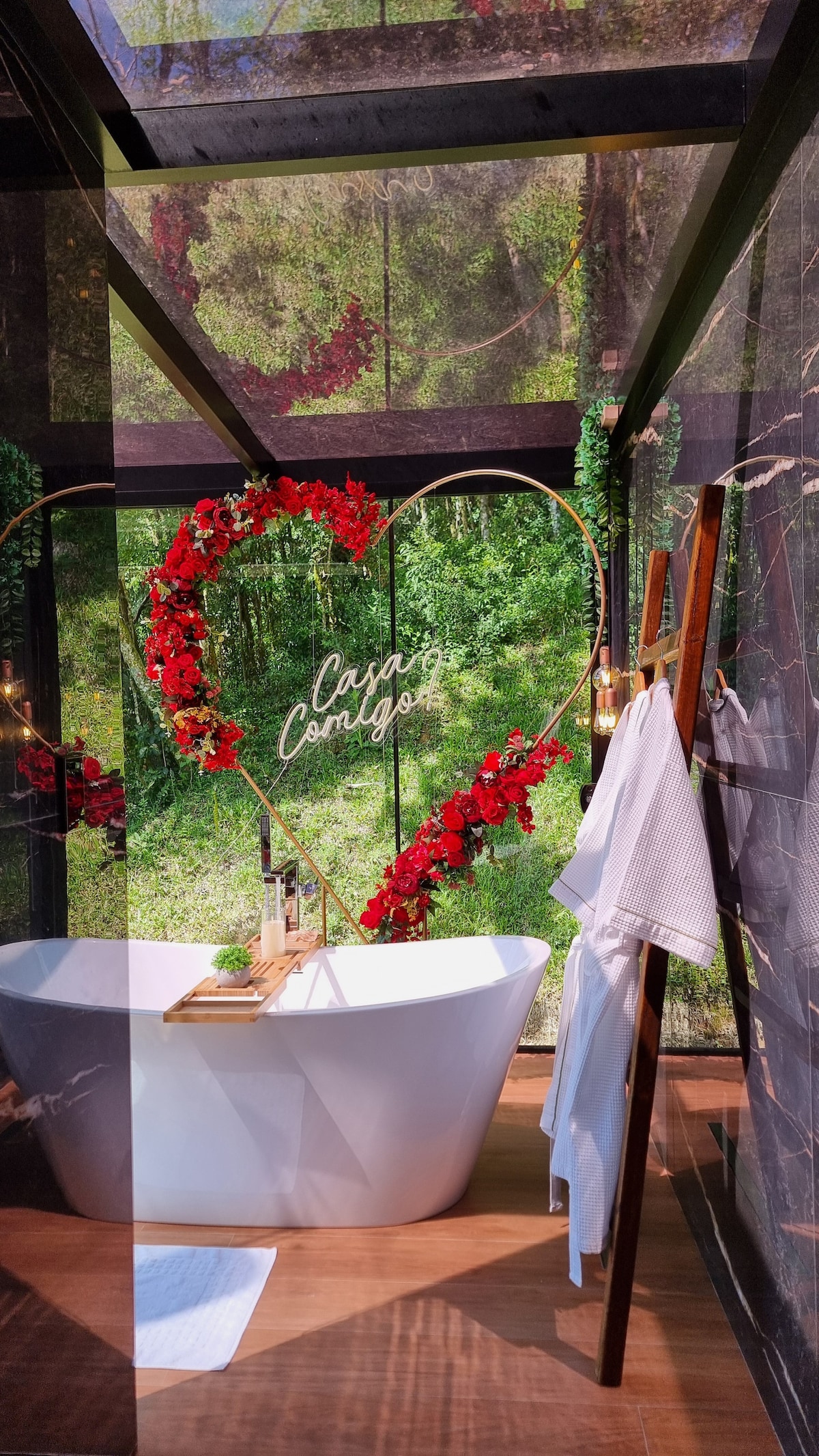 SERRA DO RIO Rastro YAXINLIĞINDA. Kabinənin hər yerində "yaşıl" mənzərələr var. Vanna örtüyün altındadır və təbiətlə tam inteqrasiya olunub, sanki meşədədir, lakin qapalı məkanda olmağın rahatlığı və təhlükəsizliyi ilə seçilir. Quşlar istisna olmaqla, məkan olduqca məxfi və sakitdir. Yağışlı günlərdə şüşə tavan təmasa və istirahət hissinə yaxınlaşır. Qazla qızdırılan bütün kranlarda isti su var.