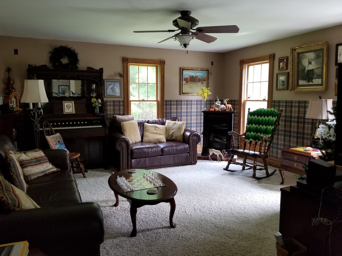 Qonaqlar 3300 kv. fut (təxminən 307 kv. m) sahəsi olan evimizin qalan hissəsindən, o cümlədən yığıncaq otaqlarından, mətbəxdən, kitabxanadan/ofisdən və yemək sahələrindən çəkinmədən istifadə edə bilərlər. Ayrıca otaq bron edin, öz yeməyinizi və şəxsi gigiyena vasitələrinizi gətirin və evdə rahatlıqdan zövq alın. Bu Kənd Şık Ferması bütün bəzəkləri və xatirə əşyaları ilə sanki bir muzeydir.