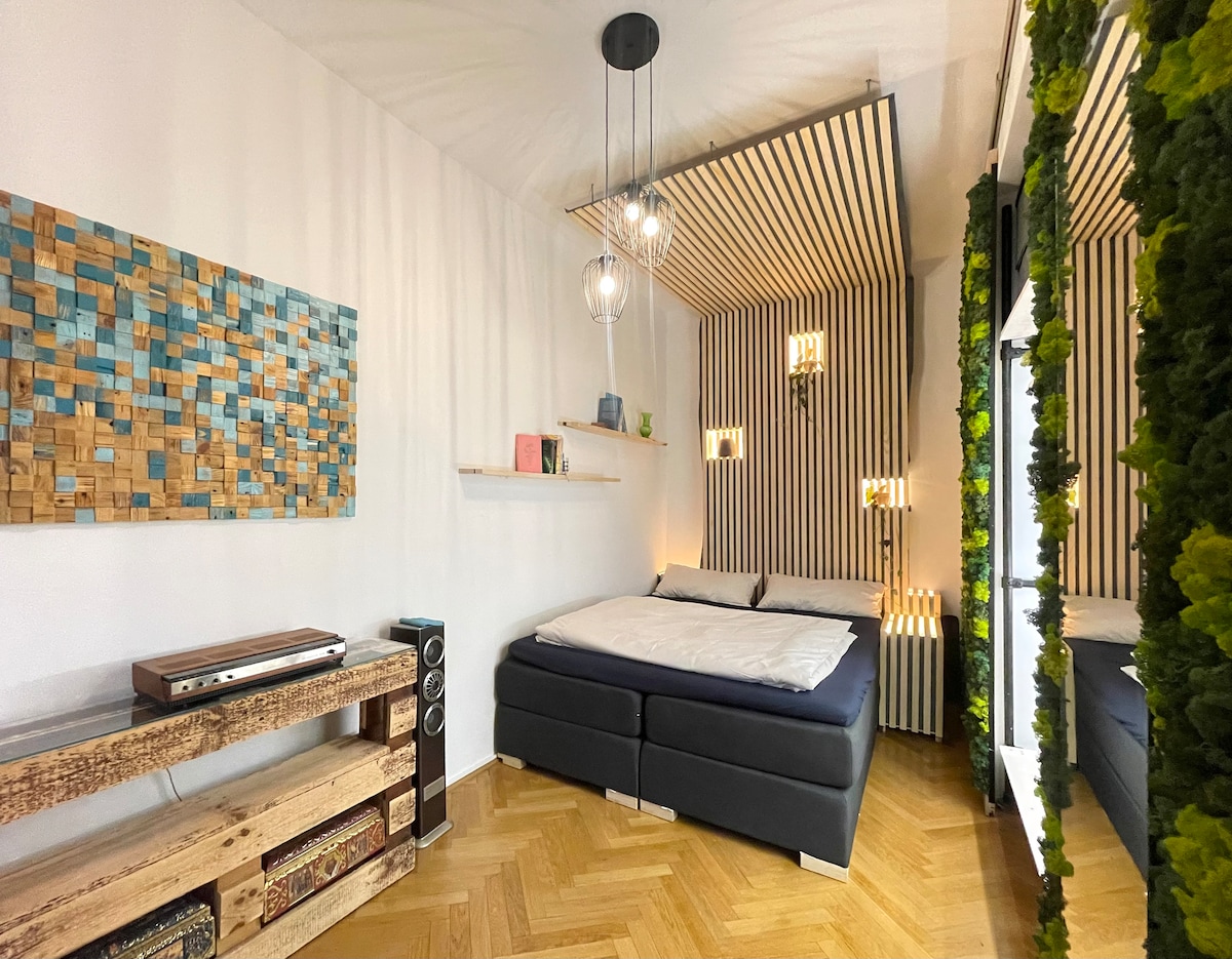 English: City life but make it comfy? Welcome to the Nest, where Vienna feels like a village while vibrant city life is only 10 minutes away! The spacious flat offers every amenity your heart desires- fast internet, a large comfy bed, AC, a cozy couch for long movie nights and a well equipped kitchen for cooking experiments - you basically don't need to leave the house in all pandemic fashion style.