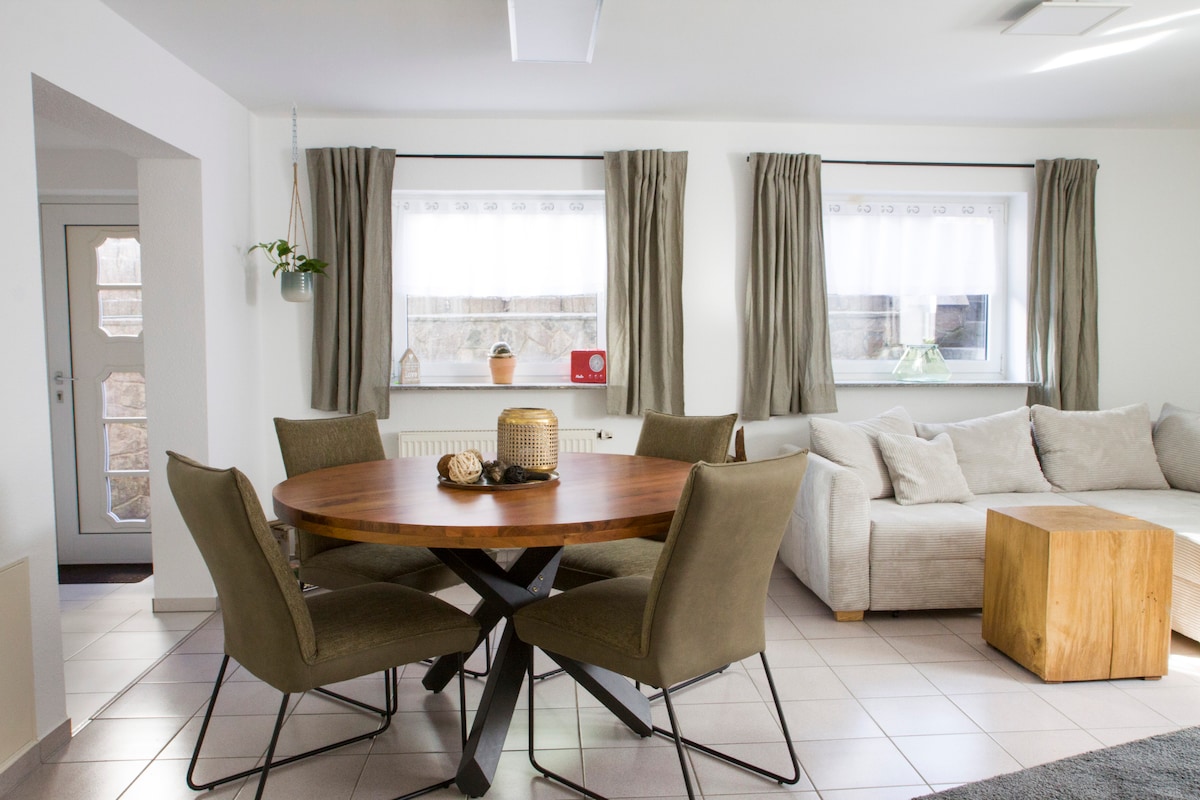 Ştadtştadt meşəsinin kənarında, eyni zamanda şəhərə yaxın 1-ci mərtəbədə yerləşən 110 kvadratmetrlik dəbli mənzil. Cütlüklər, ailələr, işgüzar səfərlər və velosipedçilər/elektrik velosiped sürənlər üçün idealdır. 2 yataq otağı + açılan divan, müasir mətbəx, hamam və bağ mənzərəli loja. Ayrı giriş, parkinq və velosiped qarajı daxildir. Wi-Fi (DSL 50,000), Netflix və evdən işləmək üçün masa. Əsas velosiped yolu 5 dəqiqəlik məsafədədir, printer və skanerlə istifadə edilə bilən ofis/konfrans otağı mövcuddur.