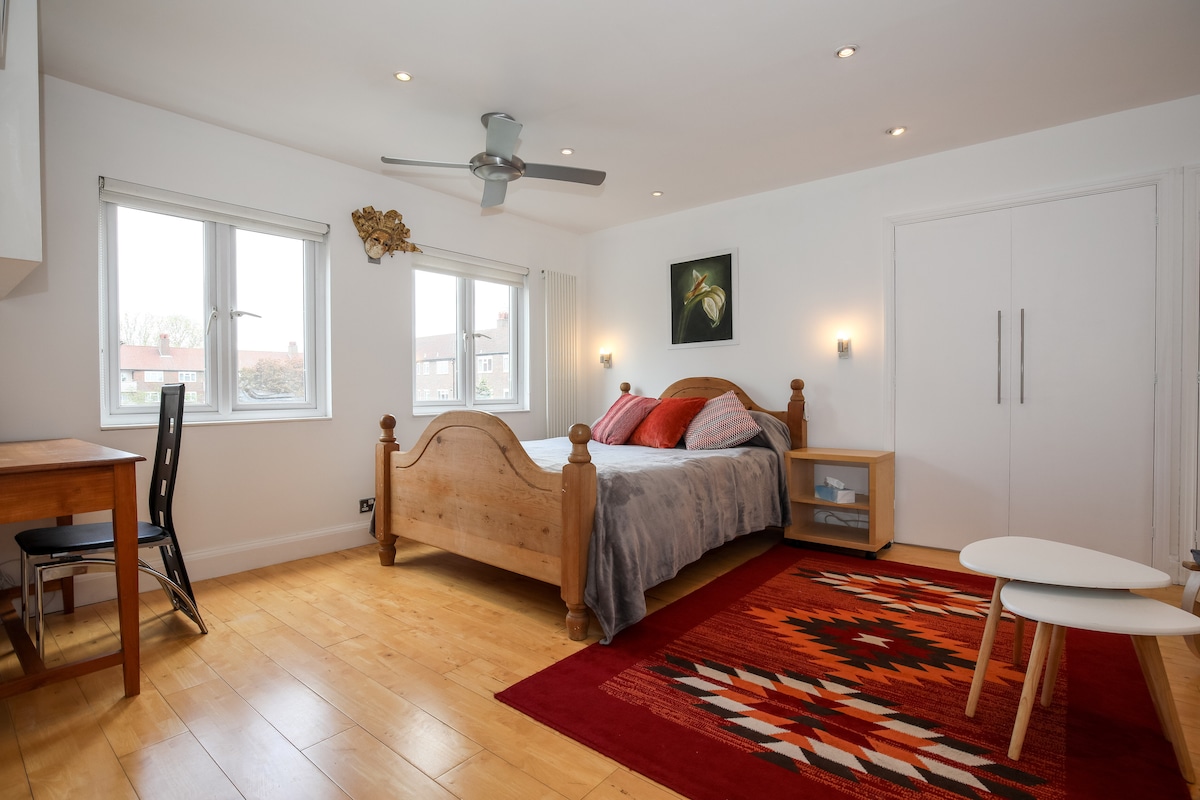 Bu ən üst mərtəbədəki studiya mənzil əsl incidir, Londonun mərkəzinə yaxındır. Bu, Finçlidəki sakit, geniş bir sığınacaqdır. Metro stansiyası piyada 7 dəqiqə məsafədədir və Londondakı bütün görməli yerlərə getmək 25 dəqiqə çəkir. Ayrı vanna otağı və kiçik mətbəx. Kinq-sayz çarpayıda lüks yorğanlar və Alpaka örtükləri ilə zərif otel yataq dəstləri, eləcə də tük və ya allergiyaya qarşı yastıqlar var. Küçədən kənarda parkinq yeri və əsas hava limanlarına asan nəqliyyat əlaqələri mövcuddur. Sakit yerdədir, lakin kafelərə və dükanlara yaxındır.