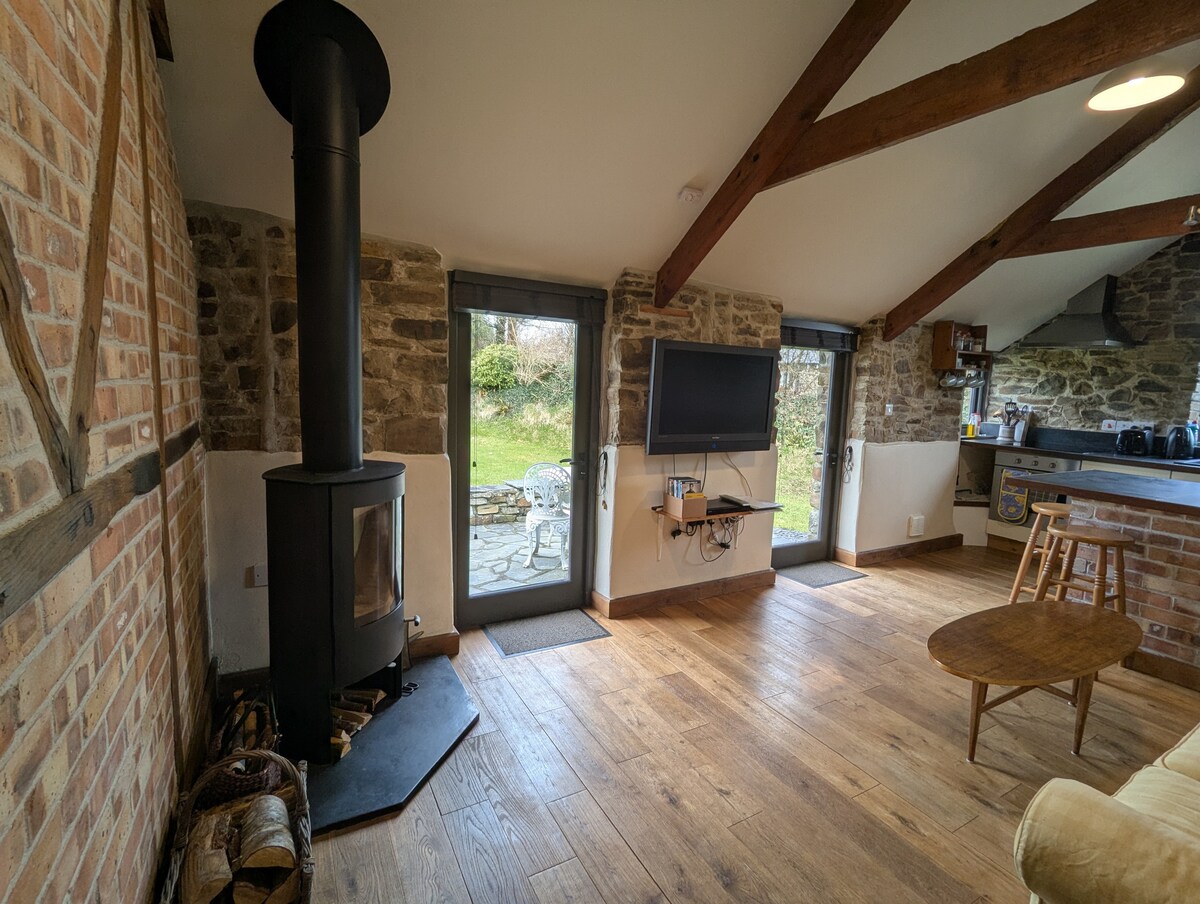This quaint detached barn is full of character and peace (no WIFI). There is an open plan kitchen/living area with a cosy log burner ( logs available at £7 cash a net) and a slate topped breakfast bar. The property has solid oak flooring throughout except for slate in the bathroom so don’t forget your slippers! The kitchen includes an oven, hob, fridge-freezer, toaster, microwave and kettle. The cosy sitting area opens out onto an attractive patio and grassy area. Sorry no pets