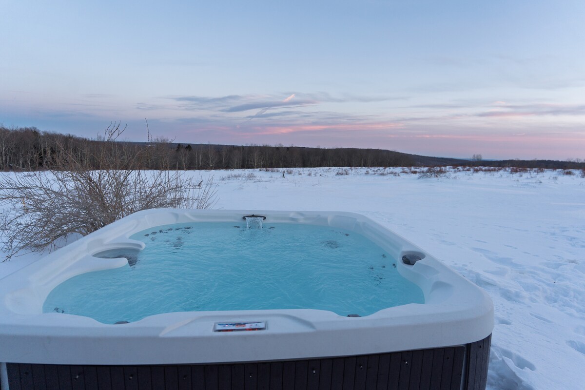 A modern 3BR/2BA Catskills retreat on 6 private acres with a hot-tub, and fireplace. Perched on a hill, this single-level home offers serenity, scenic views, mid-century modern decor, and comfort—ideal for girls' trips, couples and families. Amenities: Fireplace Hot Tub Spa Mini Ping-Pong Dart Board High-speed Wi-Fi Narrowsburg Offers: -Restaurants & Shops -Luxury Spas & Yoga -Alpaca Farm -Hiking -Farmer's Markets -Delaware Valley Arts Alliance Experience the best of the Catskills!