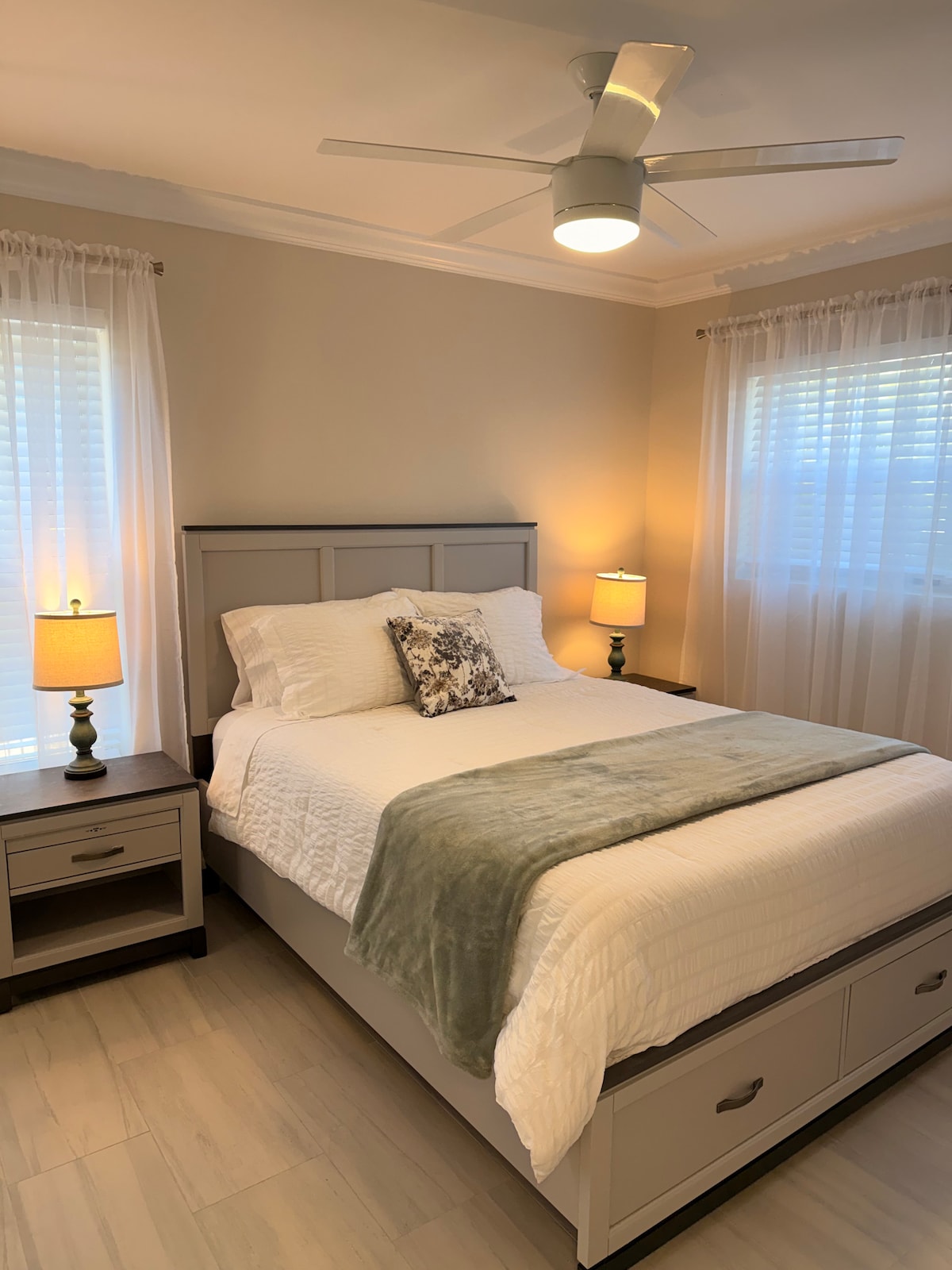 Mənzil bir yataq otağıdır, gəzinti dolabı, döşək və yaddaş forması yastıqları və minibar olan çarpayı var. Burada neflix izləmək üçün çarpayı hazırlayan futonlu bir den var və s. Qonaq otağı divan-çarpayı ilə çox genişdir Bina bərkidilir. Qonaqlar özlərini evdəki kimi hiss edəcək, tam təchiz olunub, elektrik çaydanı, su qızdırıcısı, mate, elektrik sobası, Nespresso qəhvə maşını, filtr qəhvə maşını, audio sistem, iphone və Apple Watch şarj cihazı,üç LED televizor, çimərlik əşyaları.