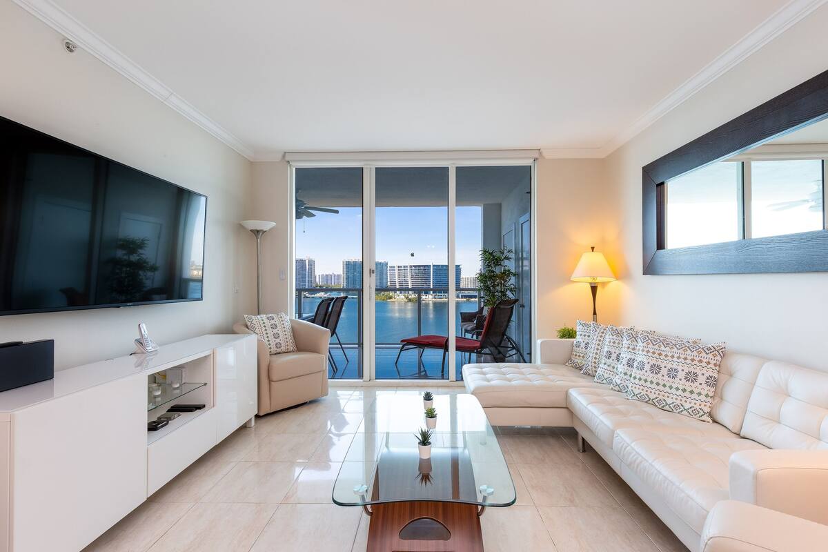 The condo is in Sunny Isles Beach Florida's Riviera, safe, clean, family friendly. On the beach and stretching across the whole beach front of the building. Offering 180 degree direct ocean views from both bedrooms and living room. 2 ensuite bathrooms plus half bathroom. No Carpeting. No resort fees. Full service building on a pristine beach in an upscale area. Super comfortable, 600 thread count sheets, 86" TV for cinema experience, fully equipped kitchen. Valet parking only $45+tax per day