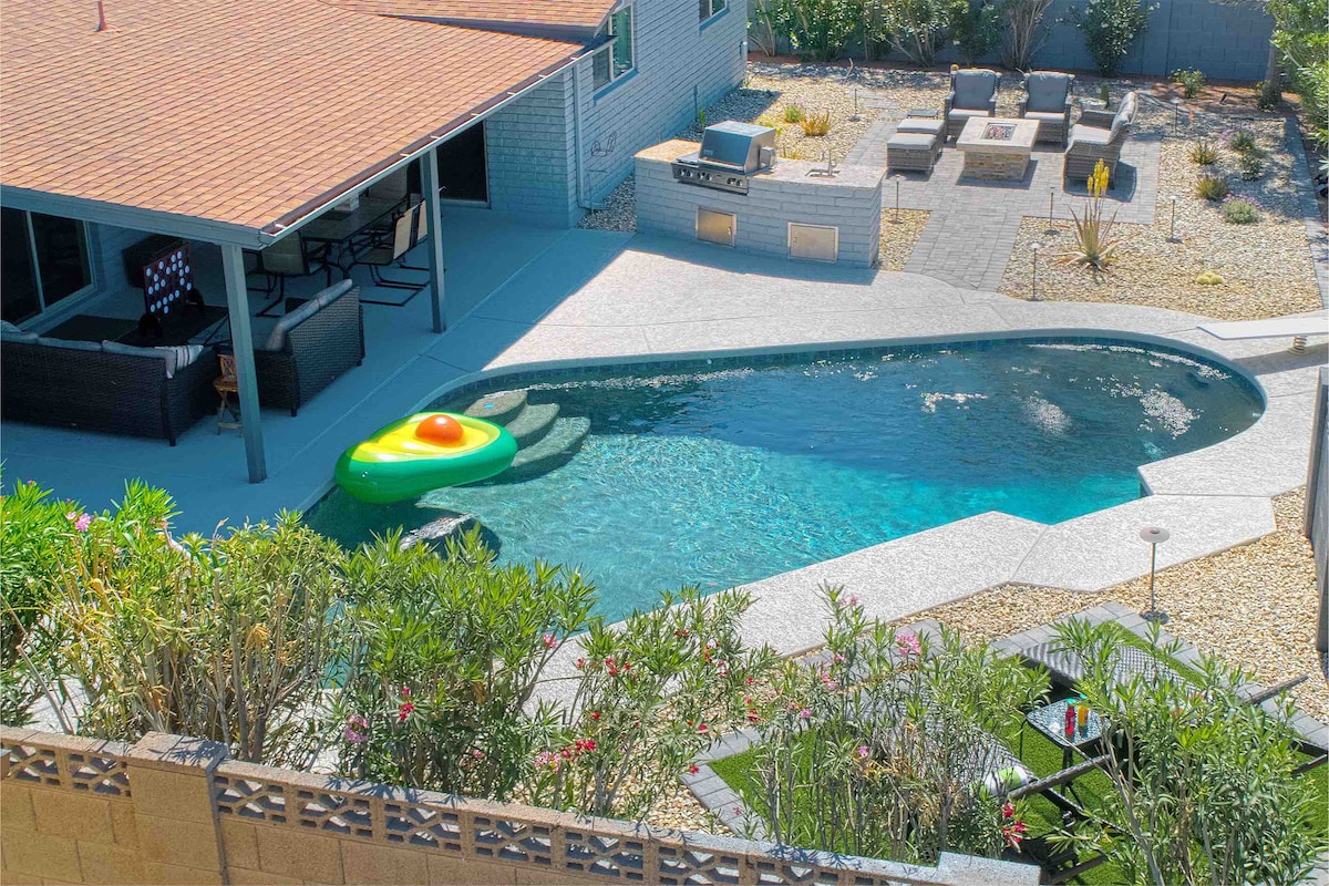 Welcome to The Hidden Hacienda Scottsdale! A fun, whimsical retreat with cowboy-chic decor, pool, spa, karaoke, and games—perfect for bachelorettes, families, or golf getaways. Sleeps 10 with comfy beds, smart TVs, a pool table and a fully stocked kitchen. Lounge beneath swaying palm trees, practice your swing on the mini putting green, or unwind in your private backyard oasis with cozy seating fire-pit and outdoor tv. Minutes to Kierland Commons, top golf courses, Spring Training and more!