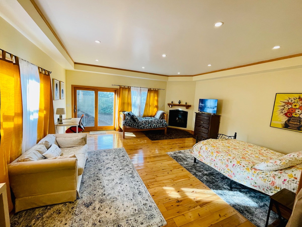 Gather around the cozy brick fireplace for evening chats in the stately wood paneled great room. Built in 1914, the Edwardian era building maintains its classic architecture while modern renovations, including sleek cabinetry, quartz counters, a spacious glass enclosed shower and a calm colour palette of cool grays, bring the period space up to date. The spacious guest suite is over 1300 square feet in size. With windows on 4 sides of the building, light pours into the space.