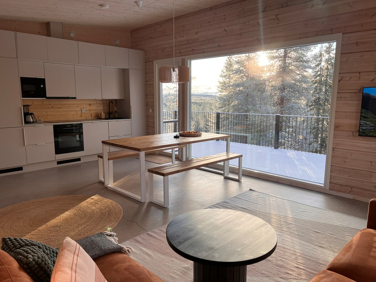 Nauti hulppeasta näköalasta tunturin päällä! Huippu sijainnilla, josta helppo pääsy suoraan laskettelurinteeseen, hiihtoladuille, retkipoluille ja pyöräreiteille. Kauniisti ja laadukkaasti sisustettu mökki, missä täysivarustus ruoan laittoon. Mökissä on oma rauha jokaisessa 3 kerroksessa. Voit majoittua useamman perheenkin kesken. Kuuma poreallas ja sauna takaavat rentoutumisen upeissa tunturimaisemissa! Lakanat eikä loppusiivous kuulu hintaan. Lakanat 30€/henk. Siivous 150€ tai itse tehty 0€.