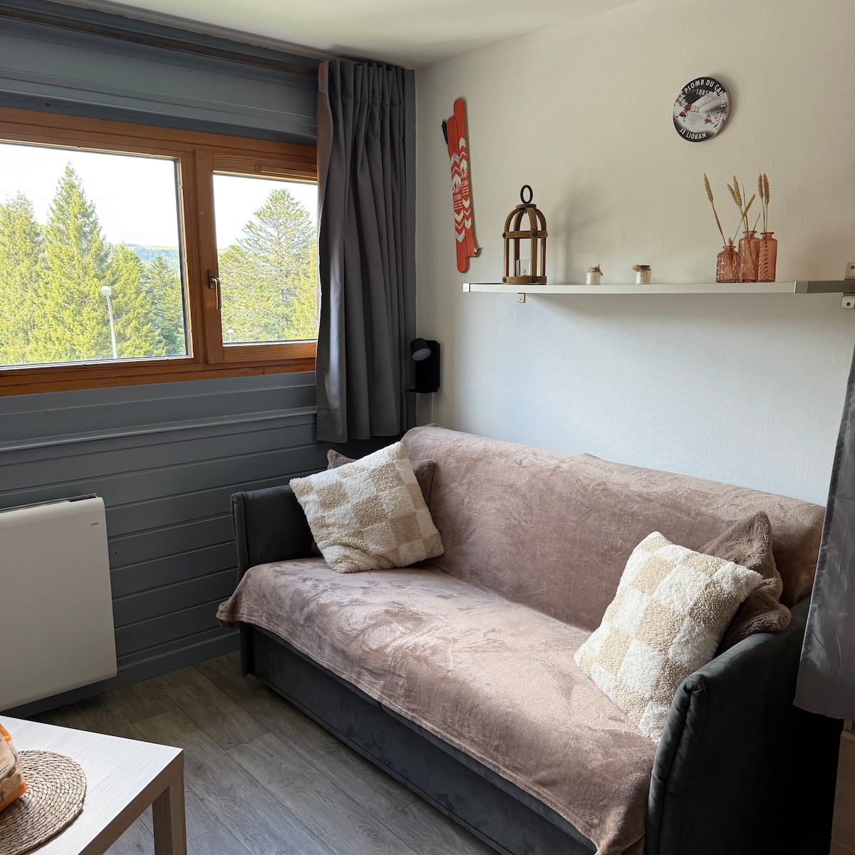 40m2 exposé Sud-Ouest : entrée, séjour cuisine, double-loggia vitré avec canapé, 1 chambre, lit double, simple, gigogne, 1salle de bain Idéal de 1 à 3 pers, poss 5 Situé dans une résidence très calme du secteur arboré Rocher du Cerf, à proximité des sentiers de rando-trails, 200m des pistes de ski/Vtt >Place de parking privée les moins du lieu : > Pas de cafetière > Draps et serviettes non fournis Pas de supplément ménage mais je vous serais reconnaissante de laisser l appart rangé etpropre