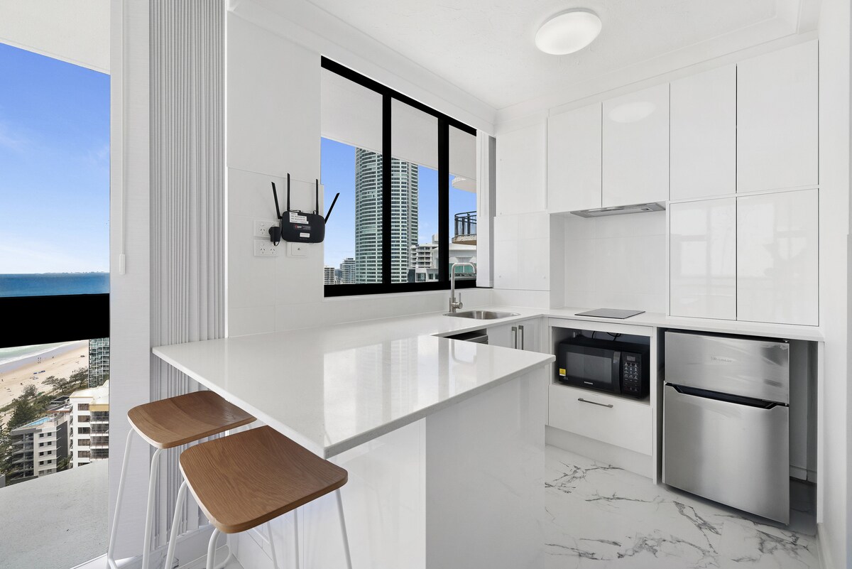 Bu yeni lüks 2 otaqlı, 2 otaqlı künc mənzildən birbaşa okean və şəhər mənzərəsi. 50+ səviyyəsində səmada yüksəkdə olacaqsınız. Mənzil yeraltı avtomobil DAYANACAĞI ilə örtülmüş binalarda PULSUZ parkinqlə tamamlanıb. Mərkəzi Sörfçülər Cənnətindəki ən yeni binada mütləq çimərliyə yaxın yer. Mənzil sürətli 5G Wi-Fi və daha çoxu daxil olmaqla qonaqlamanız üçün lazım olacaq hər şeylə təchiz olunub. İstilik sistemi olan açıq və qapalı hovuzlardan, spa mərkəzindən, saunadan, idman zalından, restoranlardan və kafedən zövq alın!