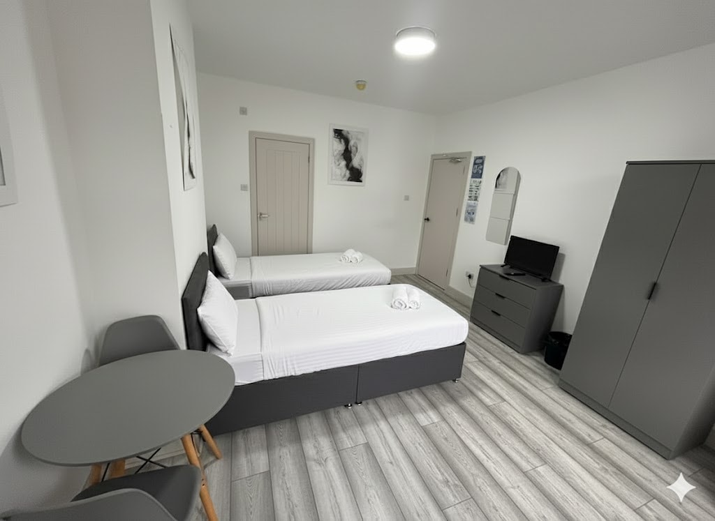 Monthly rate available by contract - Hotel En-suite Standard Double Room type with private shower & toilet - Easy access to Heathrow Airport, Twickenham Stadium, BP Sunbury etc. - 30mins direct train to London Waterloo - 24hrs Airport bus outside - Free Wifi - Air conditioned - Shared kitchen - PAYG laundry - Free parking (Limited space) - Secure digital doorlocks, keyless check in/out - 24 hrs CCTV in public area of the hotel