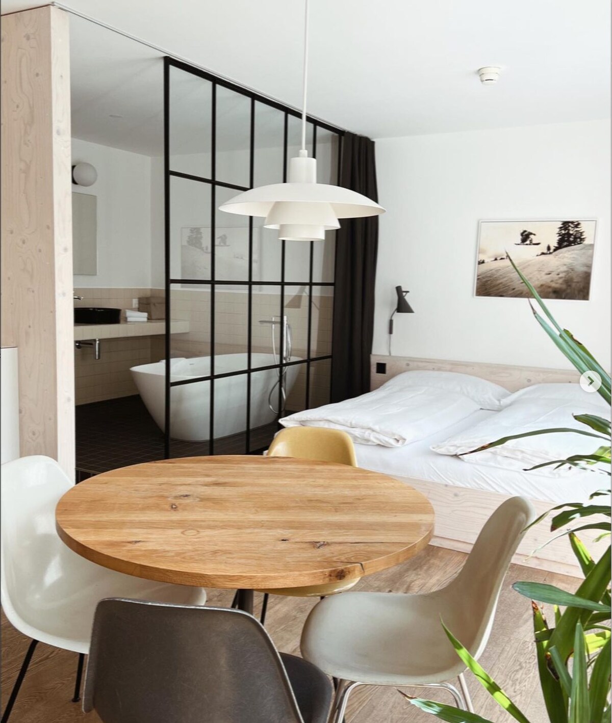 Welcome to the Belmont. This bright and stylish room offers the perfect blend of comfort and alpine sophistication — ideal for couples, ski enthusiasts, and anyone looking to enjoy the winter magic of Flims-Laax. 🛏 The Space Enjoy a bright, beautifully furnished room with a comfortable king-size bed, a cozy sitting area, and large windows that fill the space with natural light. 🛁 Bathroom The luxurious bathroom features a large bathtub, a walk-in rain shower, and a double vanity.