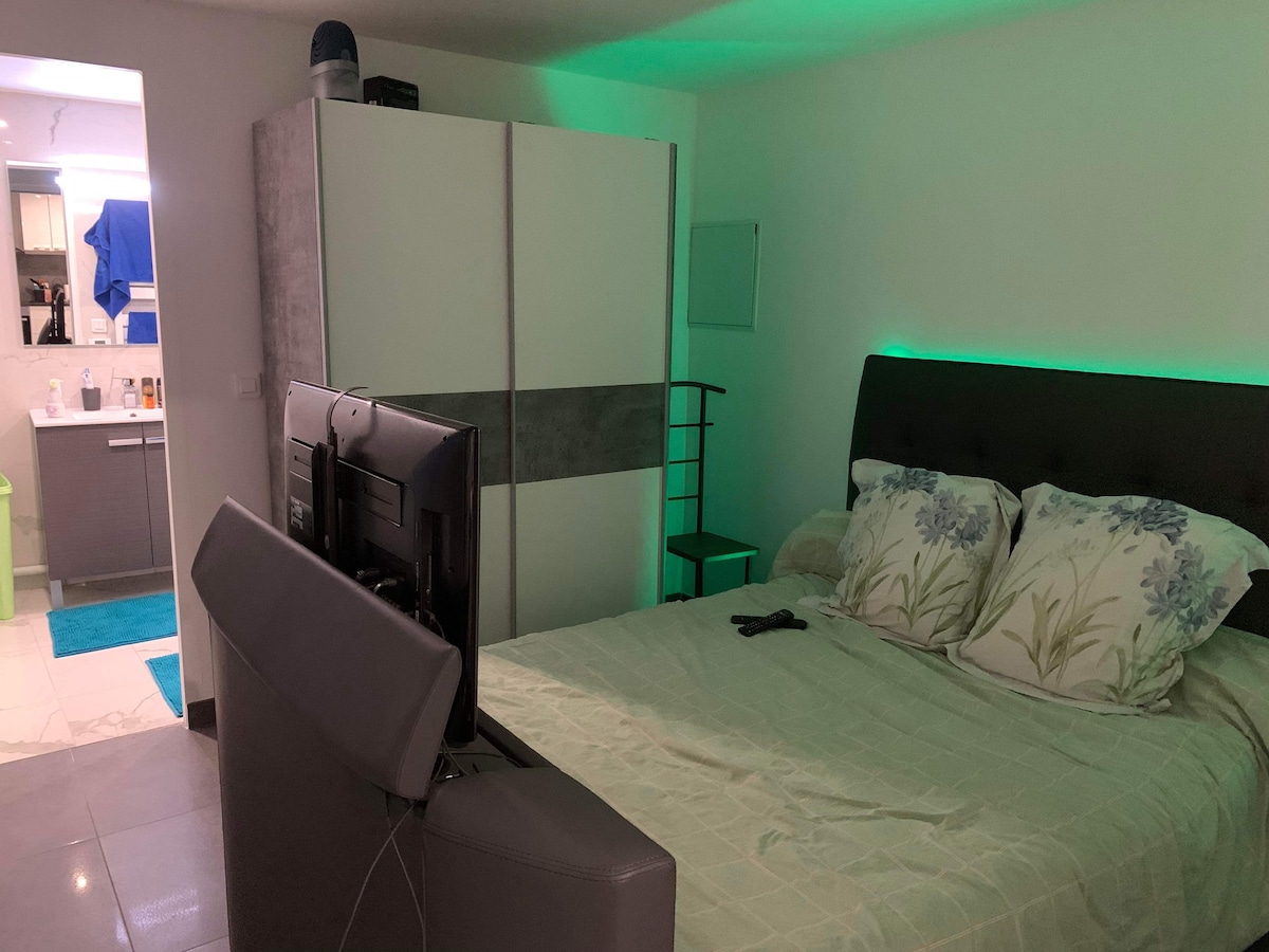 RER B Le Bourget-dən 8 dəqiqəlik məsafədə (Gare du Nord-dan 10 dəqiqə) və ya A1 magistral girişindən 2 dəqiqə (Chapelle-a 9 dəqiqəlik qapı.. tıxaclar istisna olmaqla) sizə üçümüzlə paylaşdığımız evin müstəqil studiyasını təklif edirəm. Studiyaya giriş evdən asılı deyil, lakin bağ geniş yayılıb. Studiya yenilənib və paytaxtda xoş qonaqlama üçün bütün komfortlara malikdir. Paltaryuyan maşın, Wi-Fi, Netflixli televizor, kondisioner.