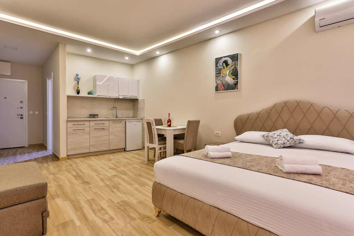 Hər otaqda kondisioneri və dənizə açılan möhtəşəm mənzərəsi olan bu gözəl, sakit, yeni tikilmiş mənzil Bar ziyarətinizdən zövq almaq üçün mükəmməl bir yerdir. Ev və klassik toxunuş təmin etmək üçün diqqətlə hazırlanmış füsunkar mebel ilə qonaqlamanızdan həqiqətən zövq alacaqsınız. Təmizlik bizim ixtisasımızdır! Sakit bir küçədə, çimərlik, alış-veriş və görməli yerlərdən 3 dəqiqəlik məsafədə yerləşir. Bütün bar attraksionlarına asanlıqla çata bilməyiniz üçün ictimai nəqliyyat yaxınlıqdadır