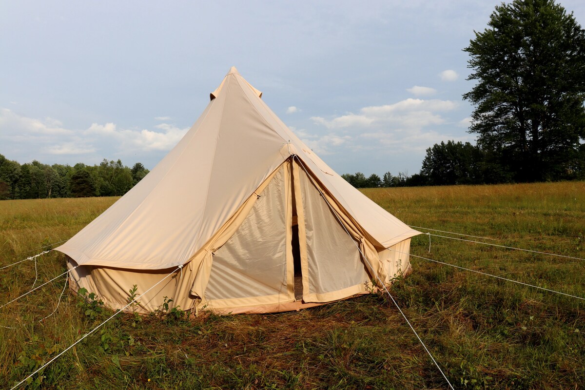 Əsl, tam ölçülü çarpayısı olan böyük kətan zəng çadırında ulduzların altında qonaqladığınız zaman hər şeydən uzaqlaşın. Watkins Glen və Seneka Şərab Cığırından qısa bir məsafədə meşəyə çevrildi. Paylaşılan müasir hamam evi içməli su və duş ilə ərazidən qısa məsafədədir. Əmlak şəbəkədən kənardadır (elektrik enerjisi yoxdur), bu isə əla ulduz baxışı deməkdir! Döşəkağılar təmin edilir. Ərazidə rahatlamaq üçün oturacaqları olan od çuxuru da var. "Qeyd edilməli digər təfərrüatlara" baxın