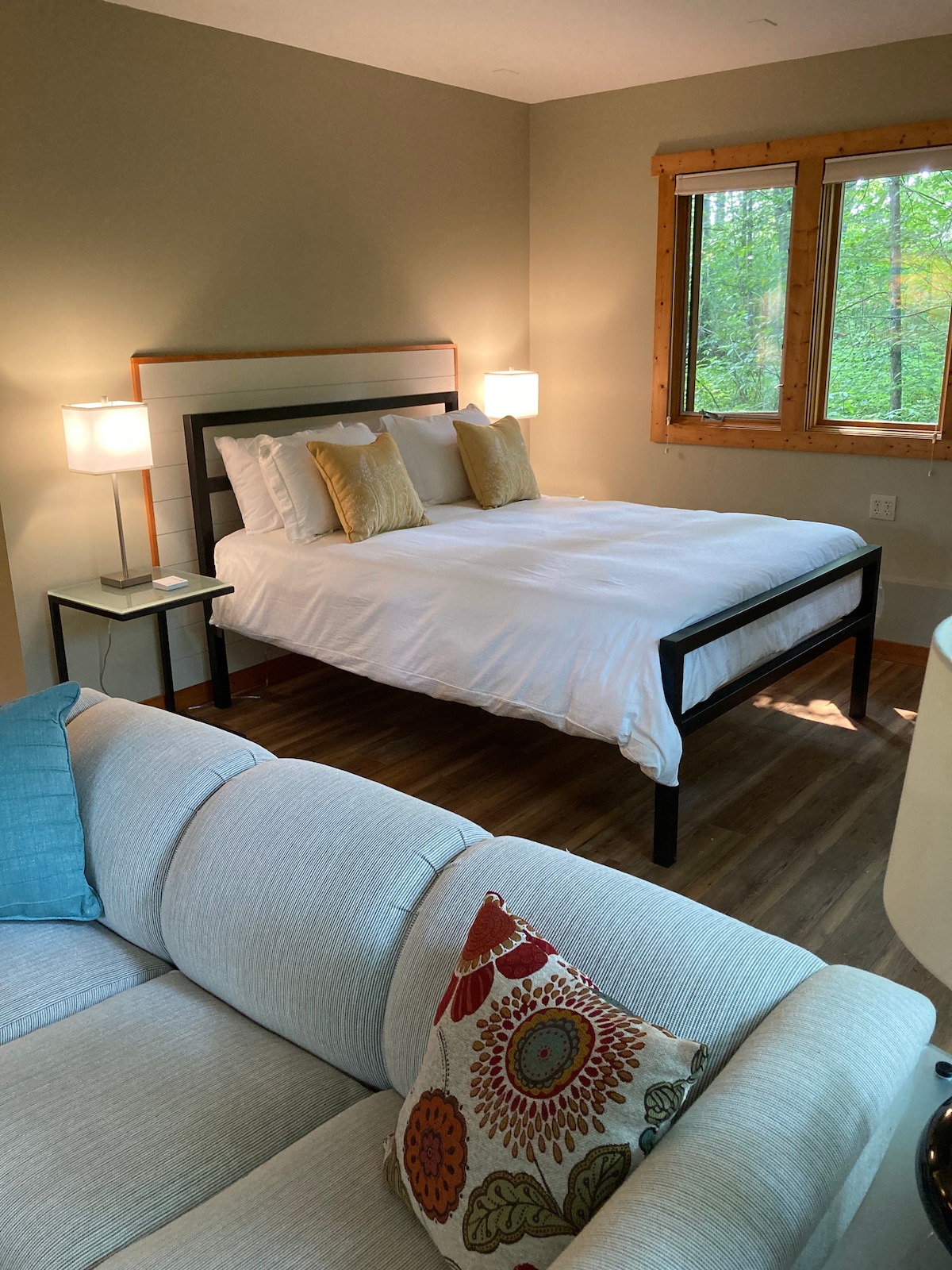 Stylish, one room living in gorgeous, central Leelanau- bustling village of Lake Leelanau, close to Leland. Our guesthouse is light & bright , overlooking the beauty of the gardens from a warm & cozy space. We welcome visitors & hope you find comfort in our eco-friendly, solar powered tiny home. A big comfy sofa, snug loft bed, soft sheets, walk-in shower, mini fridge. Great main rd location in village center, easy walk to wineries, restaurants, & grocery. Perfect base for relaxing & exploring!