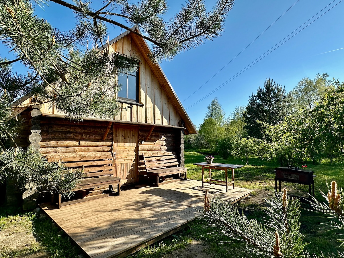 Təmirli taxta evimiz 1938-ci ildə tikilib, meşə və tarlalarla əhatə olunub. Təbiət qoynunda qalmağa yer. Məşğul şəhər həyatından qaçış təmiz ölkədir. Rahat taxta evimiz Jelgava şəhərindən cəmi 12 dəqiqəlik, Riqadan isə 55 dəqiqəlik məsafədə yerləşir. Ev romantik tətil və ya uşaqlı ailə üçün uyğundur . Evin ətrafındakı günəşli terrasda romantik axşam və dinc səhərdən zövq ala bilərsiniz.