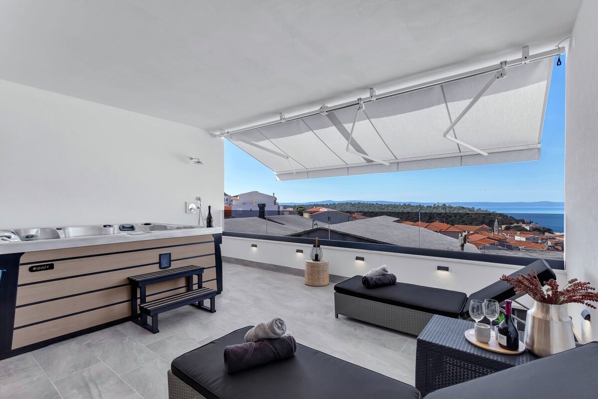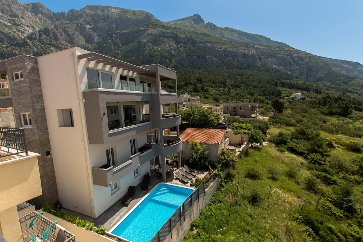 Dəniz, adalar və Biokovo dağının gözəl mənzərəsi olan böyük terrası olan yeni, müasir mənzil. Zeytun ağacları və şam ağacları ilə əhatə olunmuş terrasda cakuzi və günəş vannası üçün ayrıca yer var. Yaşayış yeri Makarskanın sakit bir hissəsində, şəhərətrafı ərazidə yerləşir. Kuk Krvaviça və Makarska şəhərləri arasında yerləşir. Şəhər, çimərlik, mağazalar üçün avtomobildən istifadə etmək tövsiyə olunur. Çimərlik: 1-1,5 km, mağaza: 1,5-2 km, yanacaq doldurma məntəqəsi: 400 m, Makarskanın mərkəzi təxminən 3 km. Piyada getmək mümkündür.