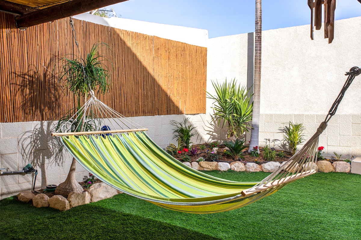 Discover a guest-friendly haven! Comfortable double bed & cozy sofa for TV & relaxation. Enjoy outdoor breakfasts & wine evenings at the backyard table. Ample closet space & perfect dining/computer table. Beach towels & snorkels provided. Easy street parking. 52-year Eilat residents, proud of our reviews & eager to host you! Book now for a delightful stay!