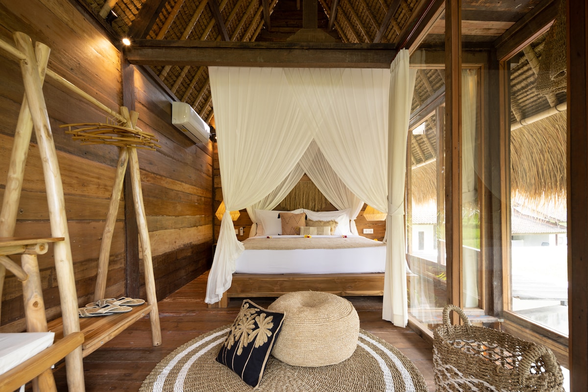 Yeni çimərlik sahili bir yataq otağı, evcik, valehedici okean və ricefield mənzərələri. Sulu tropik bağlar arasında sahilboyu dağ yamacında yerləşən bu lüks evcik Zenin əsl vahəsidir. Unikal dizayn tamamilə təkrar emal edilmiş materiallardan qurulub və evin bütün rahatlıqlarını təklif edir. Kondisionerli yaşayış sahəsi dəbdəbəli mebellərlə təchiz edilib və cakuzisi olan, rahatlamaq və heyrətamiz mənzərələri seyr etmək üçün mükəmməl olan cakuzisi olan böyük bir göyərtəyə açılır.