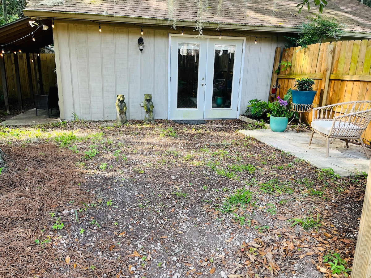 Laid back guest house located close to the marsh and 15 minutes south of the Historic District. Quiet locale with private entrance, large yard and small but cozy interior that includes a queen bed, desk and kitchenette area. Nestled under a grand live oak, the Half House is home to many birds and a barred owl that often takes residence upon the branches. Laundry avail too. For larger reservations, the main house is also on AirBnb 'Stylish & Spacious Abode in Savannah.'