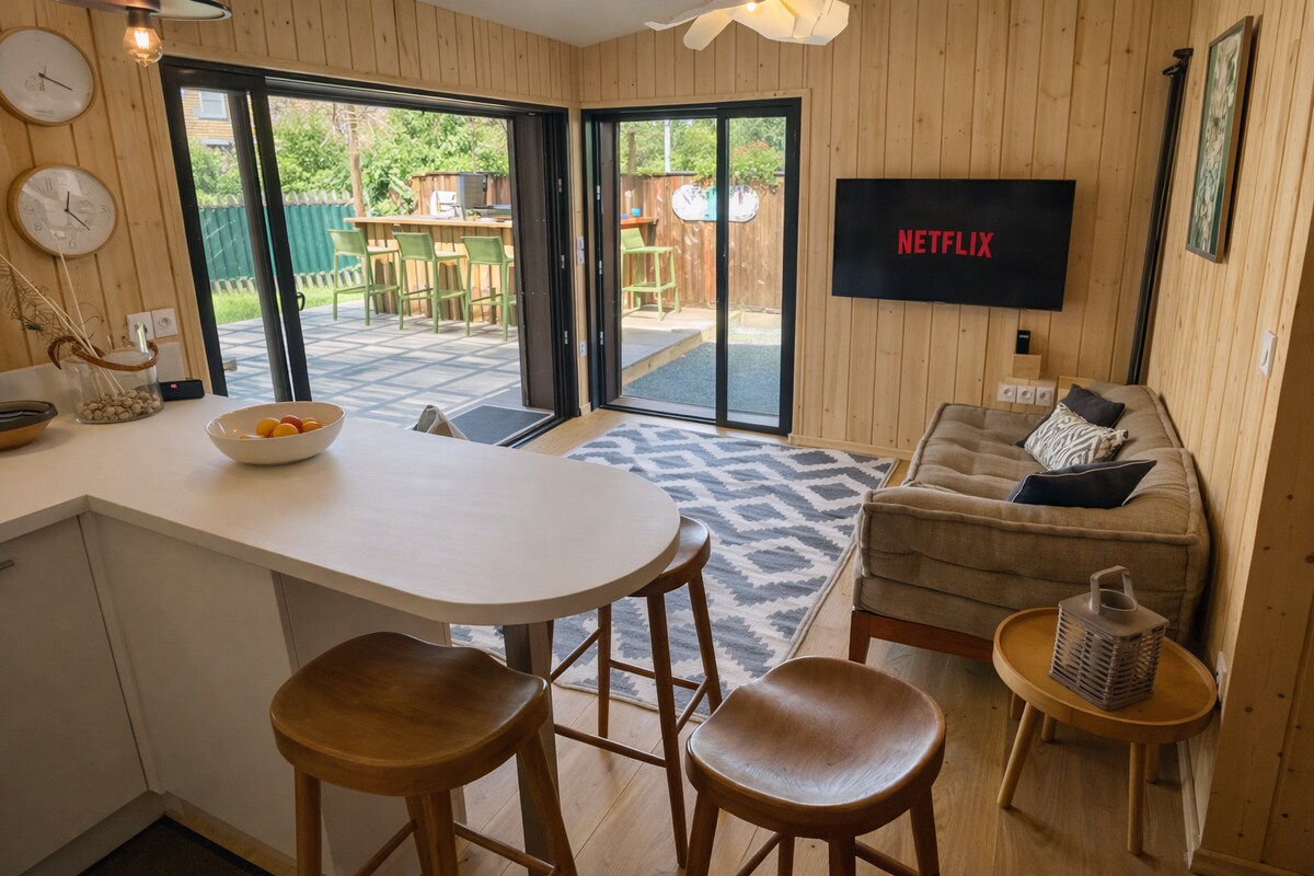 Okeandan 50 metr məsafədə yerləşən bu parlaq taxta dağ evi (75 m2) rahatlıq, əlçatanlıq və sakitliyi özündə birləşdirir. Uyğunlaşdırılmış PMR (təchiz olunmuş hamam otağı, asan hərəkət), 3 yataq otağı, tərs çevrilə bilən kondisioner, yüksək səviyyəli mətbəx və fiber + Netflix ilə qonaq otağı var. Qapalı bağ, kölgəli terras, plança və petank ilə əyləncəli anlar yaşayın. Yüngül səyahət: yataq dəsti və dəsmallar təmin edilir, çarpayılar gəliş zamanı hazırlanır, təmizlik daxildir. Ailələr, uzaqdan iş və uzunmüddətli qonaqlamalar üçün idealdır.