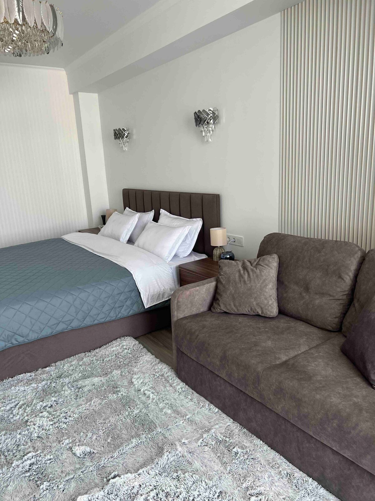 Tian Şan dağlarının möhtəşəm mənzərəsi olan 16-cı mərtəbədəki dəbli mənzil. Mənzil günəşli tərəfdə yerləşir və həmişə günəş işığı ilə doludur. Qonaqların əksəriyyəti rahat atmosfer və rahat qonaqlama üçün lazım olan hər şeyin olması sayəsində "evdən uzaqda ev" hiss etdiyini qeyd edir.