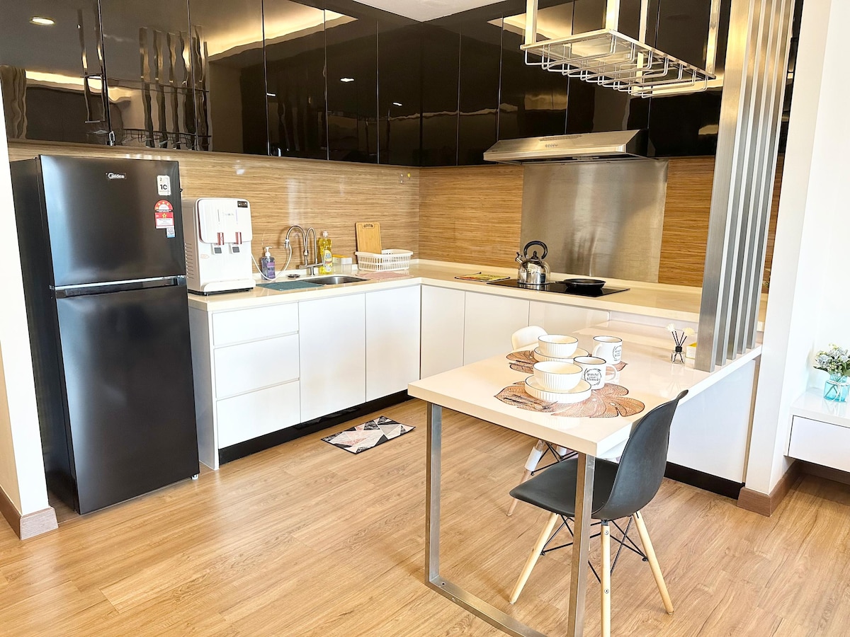 A unique Premium Studio, this fully air-conditioned apartment features a Queen Bed with plush beddings and linen adjoined with a separate living area with LED TV, Android TV Box with Premium Netflix and Youtube. It also features a bathroom with a bidet, a shower and a hairdryer. The kitchen comes with a fridge, a microwave and a stovetop, kettle and a toaster. Facilites include Oudoor Inifnity Pool, Jaccuzi, Steam and Sauna Rooms in addition to Badminton, Basketball Court and even a Mini Golf!