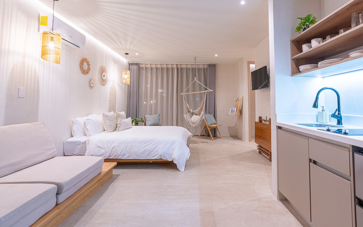 Sulu 4 otaqlı otelimizdə boho-kolonial məkanda dincəlin. Bu otaqda 150-179 sm-lik çarpayı, A/C, balaca mətbəx, açıq eyvan, təhlükəsiz parkinq, sürətli Wi-Fi, isti su və spa kimi tualet ləvazimatları təklif olunur. Hovuz kənarında istirahətdən, pulsuz qəlyanaltılardan və səhər yeməyindən zövq alın. Tamarindonun çimərliyi, mağazaları, restoranları və kafelərindən sakit, rahat və cəmi bir neçə dəqiqə. Xüsusi istəklər, nəqliyyat və fəaliyyətləri koordinasiya etməyinizə məmnuniyyətlə kömək edəcəyik.