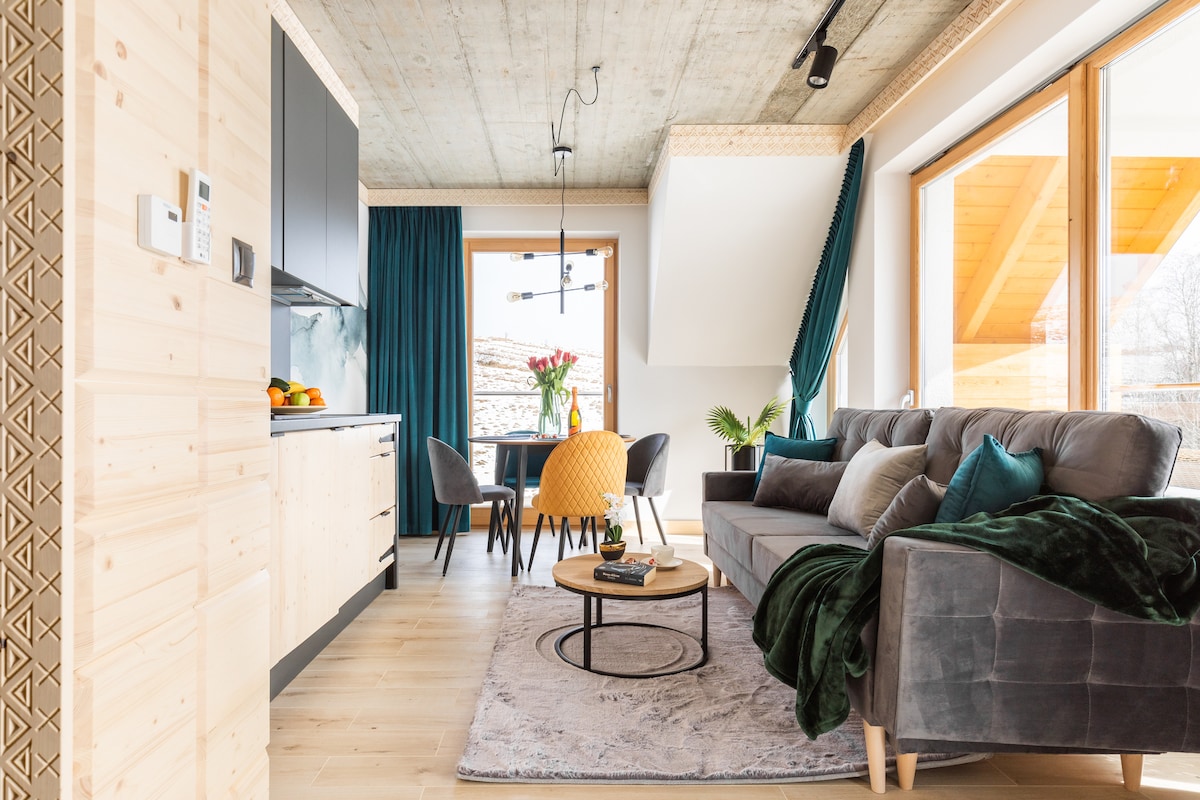 Mənzil HRUBY REGIEL (Pik adı 1339mnpm mənzilin pəncərələrindən sağ tərəfə baxırıq) Tatra cığırlarına və təbiətə yaxın tətilə zəmanət verir. Lüks şəkildə tamamlanmış, geniş və işıqlı interyer Zakopane üslubunda atmosferdə vaxt keçirdikdən sonra unikal təcrübə yaradır. Taxta interyer və taxta mebel, böyük BAĞ, çoxsaylı regional elementlər ətrafdakı dağların ab-havasını hiss etdirir.