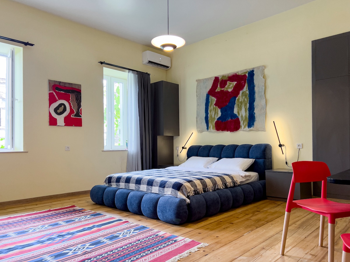 Bu möhtəşəm, naxışlı klaviatura mənzili əyləncəli rəngin partlamasıdır. Bu, Gürcüstanın mədəni irsi olan 120 illik tarixi binada möhtəşəm müasir dizaynlı mənzildir. Köhnə Tiflisin mərkəzində, Sololaki rayonunda yerləşir. Bu yaxınlarda təmir edilmiş 3 yataq otağı və 3 yataq otaqlı mənzildə 4m hündürlükdə mobil telefon, kitab kolleksiyası və buxarı kimi unikal toxunuşlar var. 3 BDR-dən 2-si master BDR-lərdir. Bundan əlavə, gözəl bağ mənzərəsi olan ayrıca balkon mövcuddur.