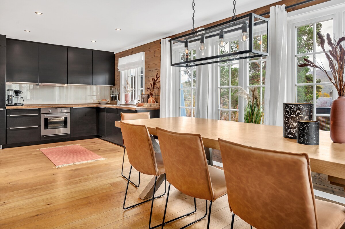 Evdən 50 metr məsafədə pulsuz parkinq mövcuddur. Ev zövqlə təmir olunub və çoxlu yataq yeri var. Yemək masası və oturma qrupundan ibarət açıq planlı qonaq otağı və mətbəx, çarpayı ilə bir yataq otağı, istilik kabelləri və duş kabinəsi olan hamam və ayrıca paltaryuyan otağı. İkinci mərtəbədə iki böyük yataq otağı və istilik kabelləri və duş kabinəsi olan başqa bir hamam var. Birinci mərtəbədəki qonaq otağından birbaşa böyük uzun masa və çoxlu oturacaqların olduğu sahəyə çıxırsınız. Yataq dəsti və dəsmalları dəst başına 150 NOK məbləğində icarəyə götürə və ya özünüzlə gətirə bilərsiniz.