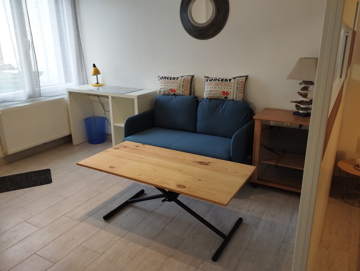 Appartement de type F1, situé au RDC d'une maison d'habitation, accès indépendant et sans vis à vis. Stationnement gratuit et facile dans la rue ou dans cour selon besoin. Appartement comprenant une pièce principale avec cuisine aménagée, mini frigo. Coin salon comprenant un lit 140X190 fait à votre arrivée, un canapé, télé écran plat et armoire. Petit couloir desservant une salle d'eau avec douche, lavabo et wc privé. Wifi gratuit. Petit déjeuner offert