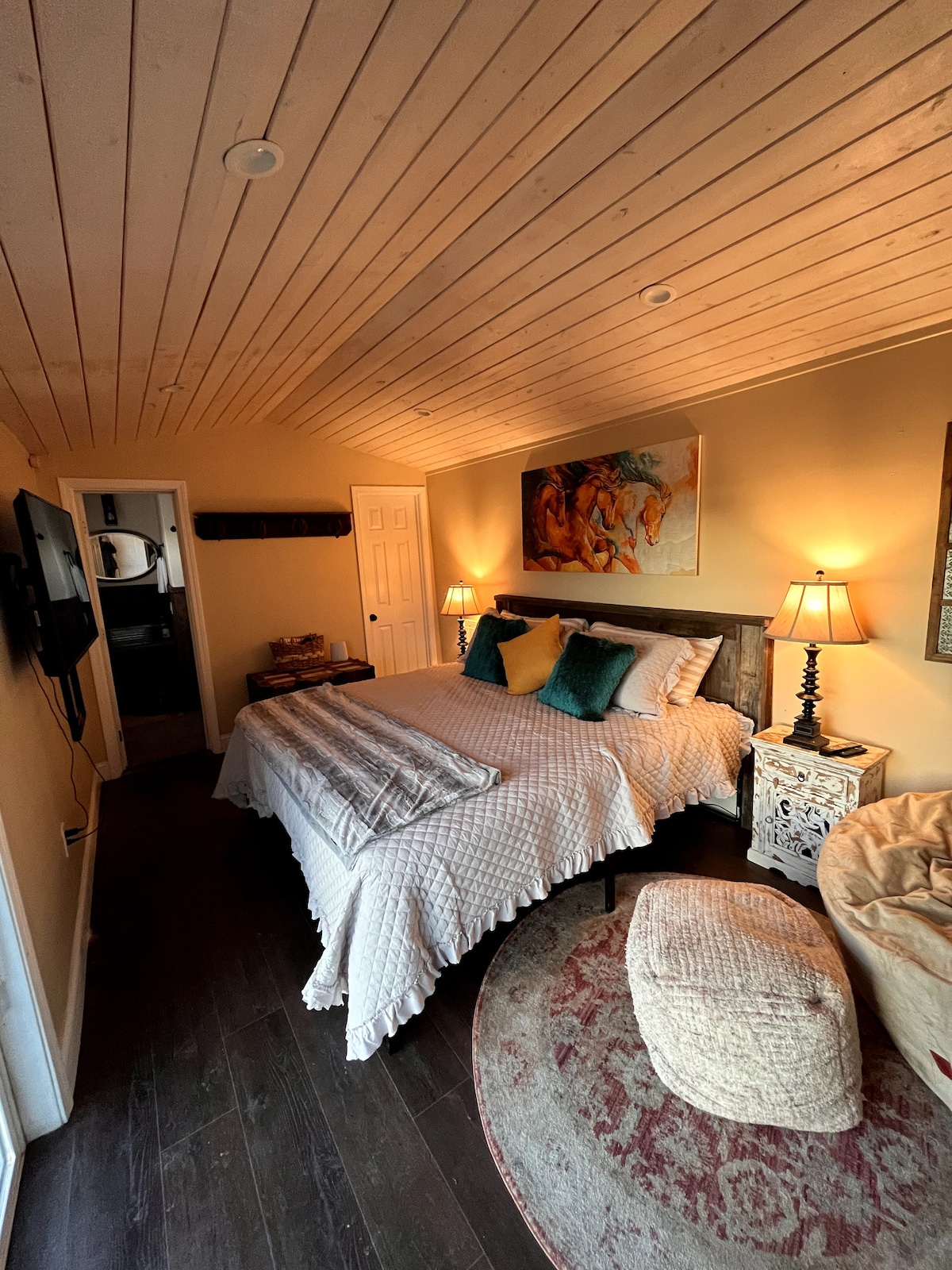 Gəlin və gecəni kiçik qırmızı anbarımızda keçirin. Bu xüsusi yer hər şeyə yaxındır və ziyarətinizi planlaşdırmağı asanlaşdırır. Kiçik anbarımızda kiçik mətbəx, böyük ölçülü çarpayı və köntöy vanna otağı var. Tam ölçülü döşəyə çevrilən sərin bir korduroy lobya çantası da daxil etmişik. Otağa Netflix və prime ilə böyük bir televizor, Kuriq qəhvə maşını, müxtəlif çaylar, yanğın çuxuru olan açıq veranda daxildir. Əmlakda atlar, pişiklər, toyuqlar və bir çox itlərimiz var.