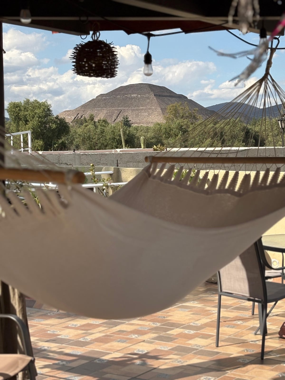 Gözəl və rahat üstüörtülü mənzil, geniş; Teotihuacan piramidalarının Teotihuacan piramidalarının dövrəsinə çox yaxındır. 2 yataq otağında paylanmış 4 qonağı qəbul etmək üçün yer ilə mətbəx, yemək otağı, terras, qonaqlama, qaraj və bağça var. Sizi salamlamaqdan və Teotihuacandakı qonaqlamanızı xoş təcrübə ilə təmin etməkdən məmnun olaram.