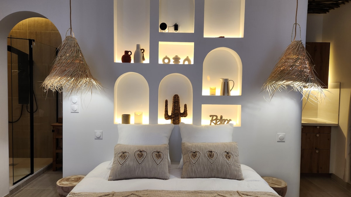 Escape to the third of our charming gîtes for 2 to 4 guests, just a stone’s throw from Lyon, in the quaint village of Vaulx-Milieu. This peaceful retreat combines rustic charm with modern comfort for a unique and unforgettable getaway. Relax in our private spa on the ground floor, featuring a 4-person jacuzzi and infrared sauna. Upstairs, the air-conditioned living area includes a kitchen, living-dining room, bathroom, and 2 bedrooms. The accommodation is entirely private. PARTIES ARE NOT ALLO
