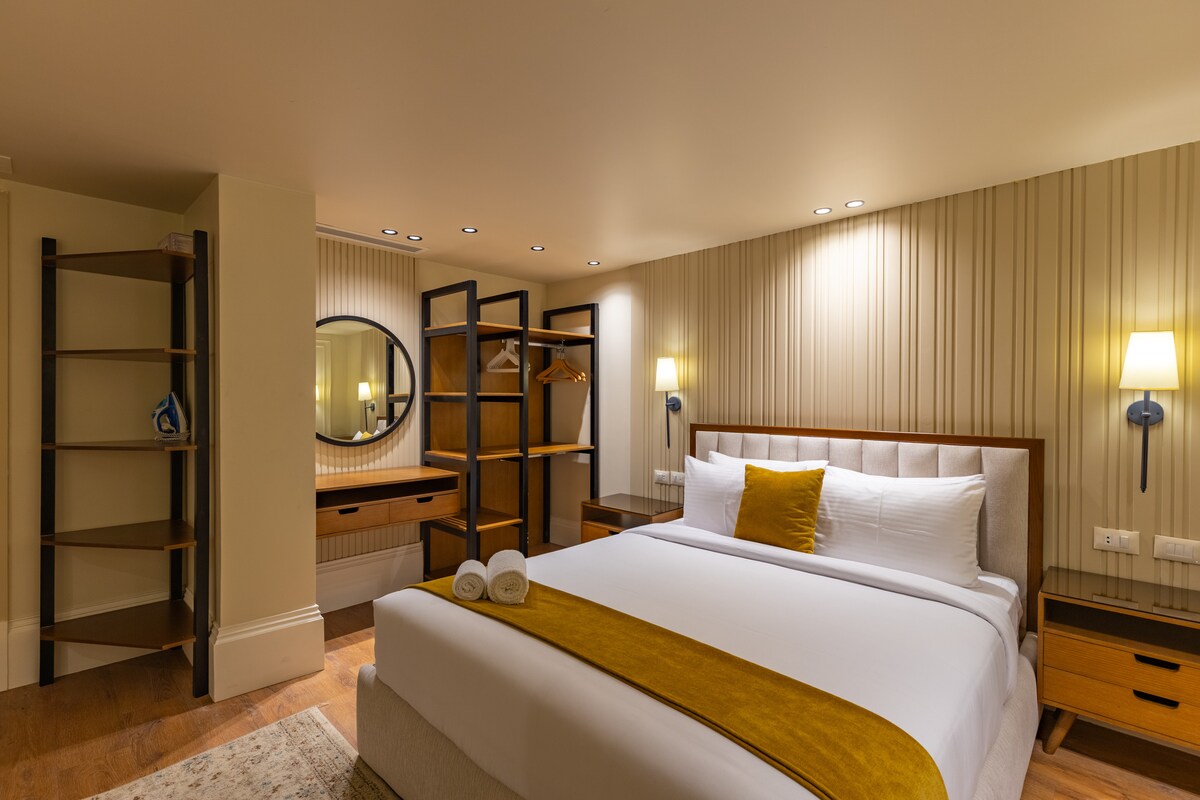 A Home-like atmosphere, with Hotel-like standards Experience a stylish 1BR apartment in a prime area in New Cairo. Just five minutes from AUC, EDNC, and Waterway, and 10 minutes from the New Capital. The living area is furnished with a Sofa Bed, complemented by a TV and Wi-Fi to keep you connected throughout your stay. The bedroom offers a serene escape, with hotel-quality linens ensuring restful nights. 1 bathroom, a dining area, a fully equipped kitchenette and air conditioning throughout.